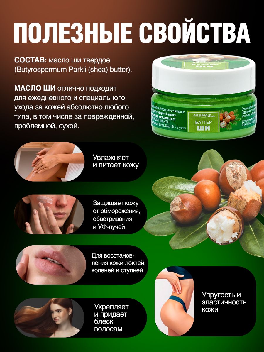 Масло ши отлично подходит для ежедневного и специального ухода за кожей абсолютно любого типа, в том числе за поврежденной, проблемной, сухой. Обладает сильными регенерирующими свойствами, активизирует синтез коллагена и способствует повышению упругости кожи.