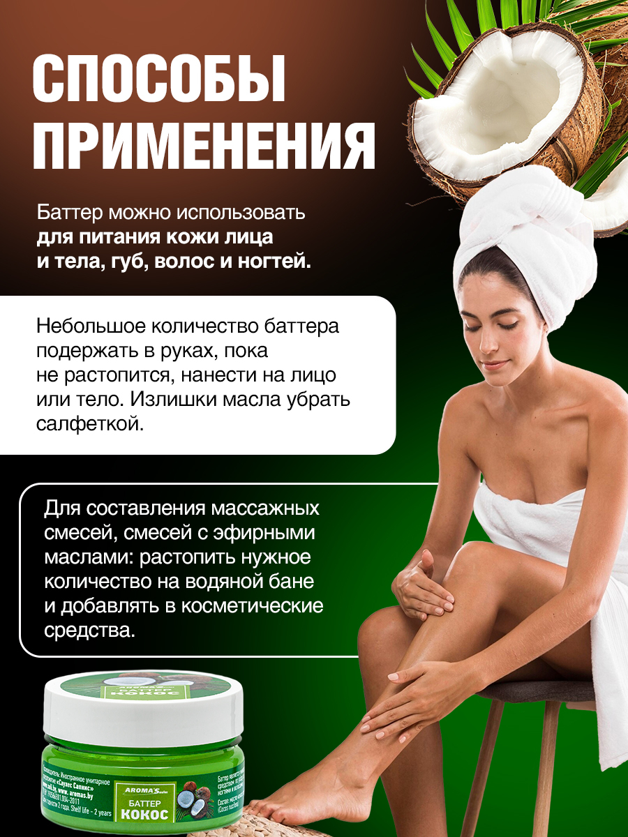 Нанесите баттер на предварительно разогретые ладони и нанесите на лицо или тело. При наличии излишков масла удалите их бумажной салфеткой.Состав
