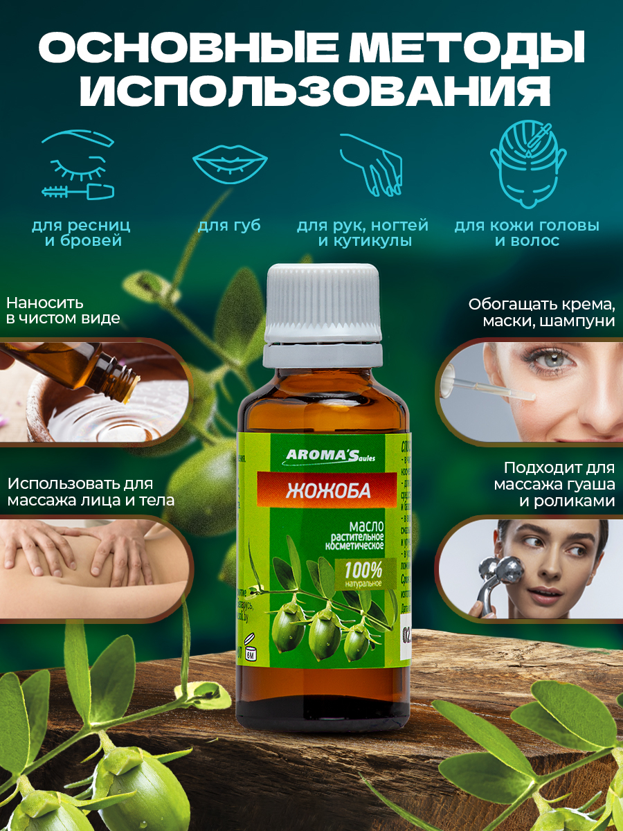 Масло жожоба используется для ежедневного ухода за кожей любого типа, в чистом виде, а также добавляется к другим растительным маслам: абрикосовому, авокадо, виноградных косточек, миндальному, персиковому в пропорции 1:1. В кремы и лосьоны добавляется 10-15% масла жожоба, в бальзамы и шампуни 3-5%.Состав