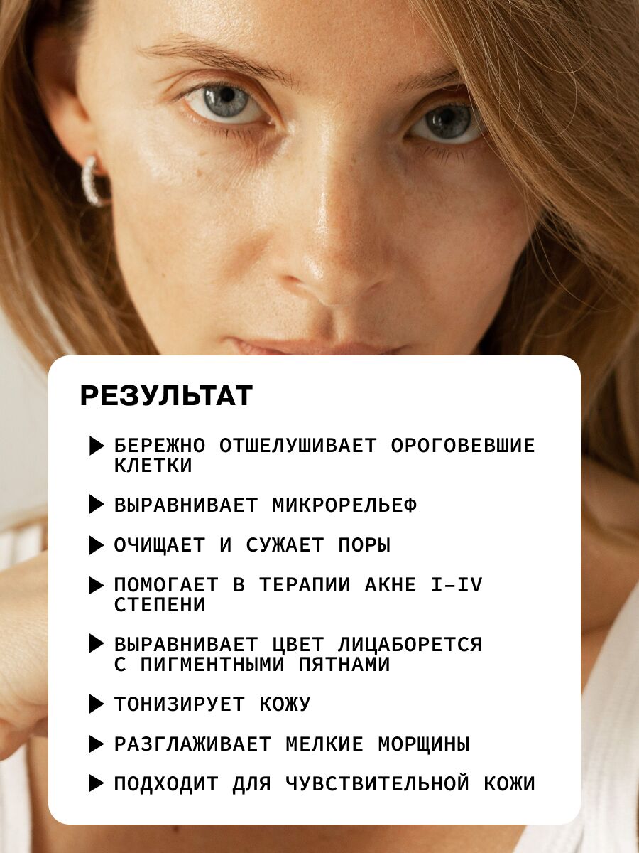 Наносить на очищенную сухую кожу. Смыть через 3–10 минут. Начинать с 3 минут, постепенно увеличивая экспозицию. По окончании времени экспозиции нанести нейтрализатор. Через 2 минуты смыть прохладной водой. После процедуры нанести увлажняющую сыворотку и крем. Выполнять вечером 1 раз в 7-10 дней. Рекомендованный курс 10–12 процедур. Обязательно использование SPF.Состав