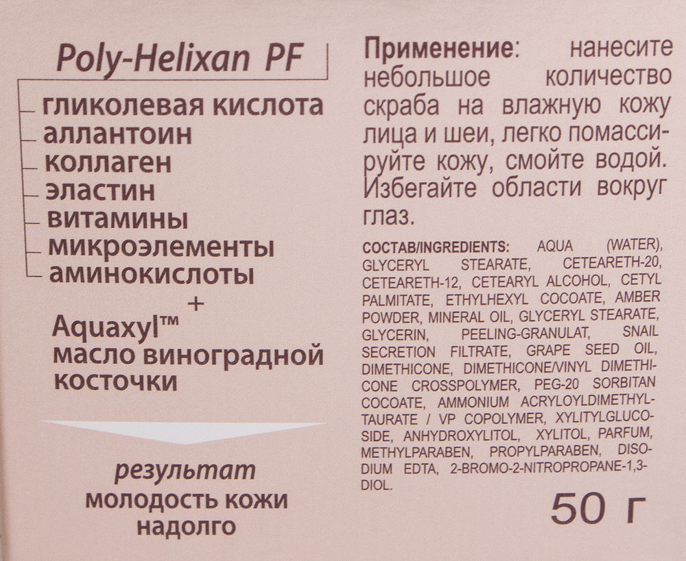 Water, Glyceryl Stearate, Ceteareth-20, Ceteareth-12, Cetearyl Alcohol, Cetyl Palmitate, Ethylhexyl Cocoate, Amber Powder, Mineral Oil, Glyceryl Stearate, Glycerin, Peeling-Granulat, Snail Secretion Filtrate, Grape Seed Oil, Dimethicone, Dimethicone/Vinyl Dimethicone Crosspolymer, Peg-20 Sorbitan Cocoate, Ammonium Acryloyldimethyltaurate/Vp Copolymer, Xylitylglucoside, Anhydroxylitol, Xylitol, Parfum, Methylparaben, Propylparaben, Disodium Edta, 2-Bromo-2-Nitropropane-1,3-Diol.