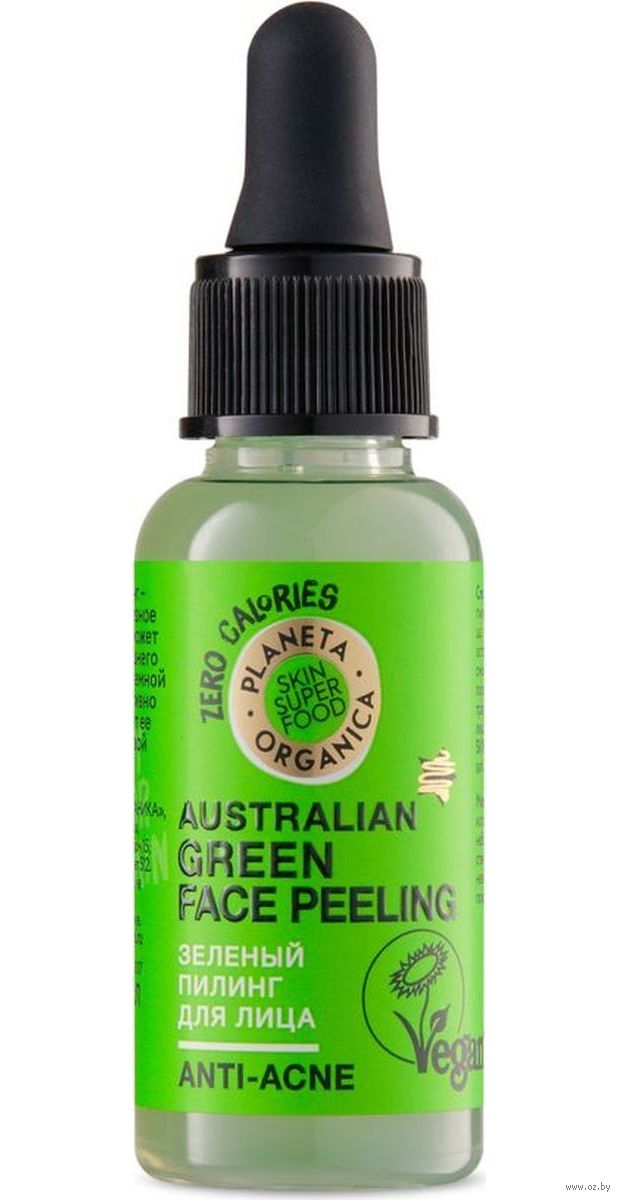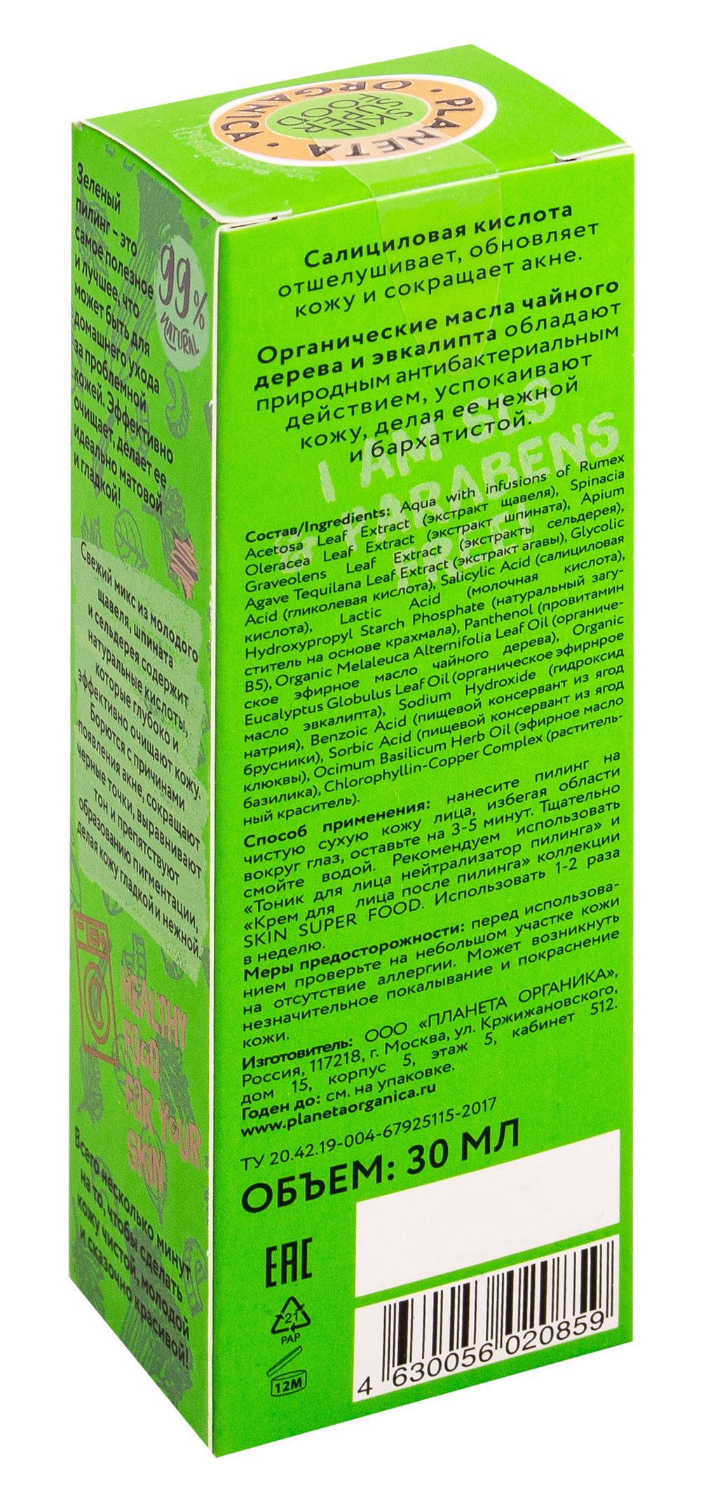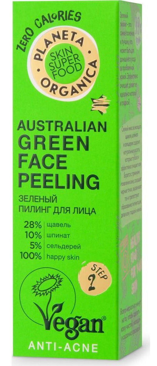 Зеленый пилинг – это самое полезное и лучшее, что может быть для домашнего ухода за проблемной кожей. Эффективно очищает, делает ее идеально матовой и гладкой. Свежий микс из молодого шпината, щавеля и сельдерея содержит натуральные кислоты, которые глубоко и эффективно очищают кожу. Борются с причиной появления акне, сокращают черные точки, выравнивают тон кожи и препятствуют образованию пигментации, делая ее гладкой и нежной. Салициловая кислота отшелушивает, обновляет кожу и сокращает акне. Органические масла чайного дерева и эвкалипта обладают природным антибактериальным действием, успокаивают кожу, делая ее нежной и бархатистой. Кожа становится по-настоящему чистой и свежей, расширенные поры сужаются, черные точки исчезают, тон выравнивается и лицо преображается.