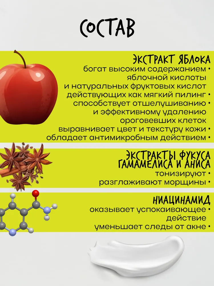 Экстракт яблока богат высоким содержанием яблочной кислоты и натуральных фруктовых кислот, действующих как мягкий пилинг, способствует отшелушиванию и эффективному удалению ороговевших клеток, выравнивает цвет и текстуру кожи, обладает антимикробным действием.