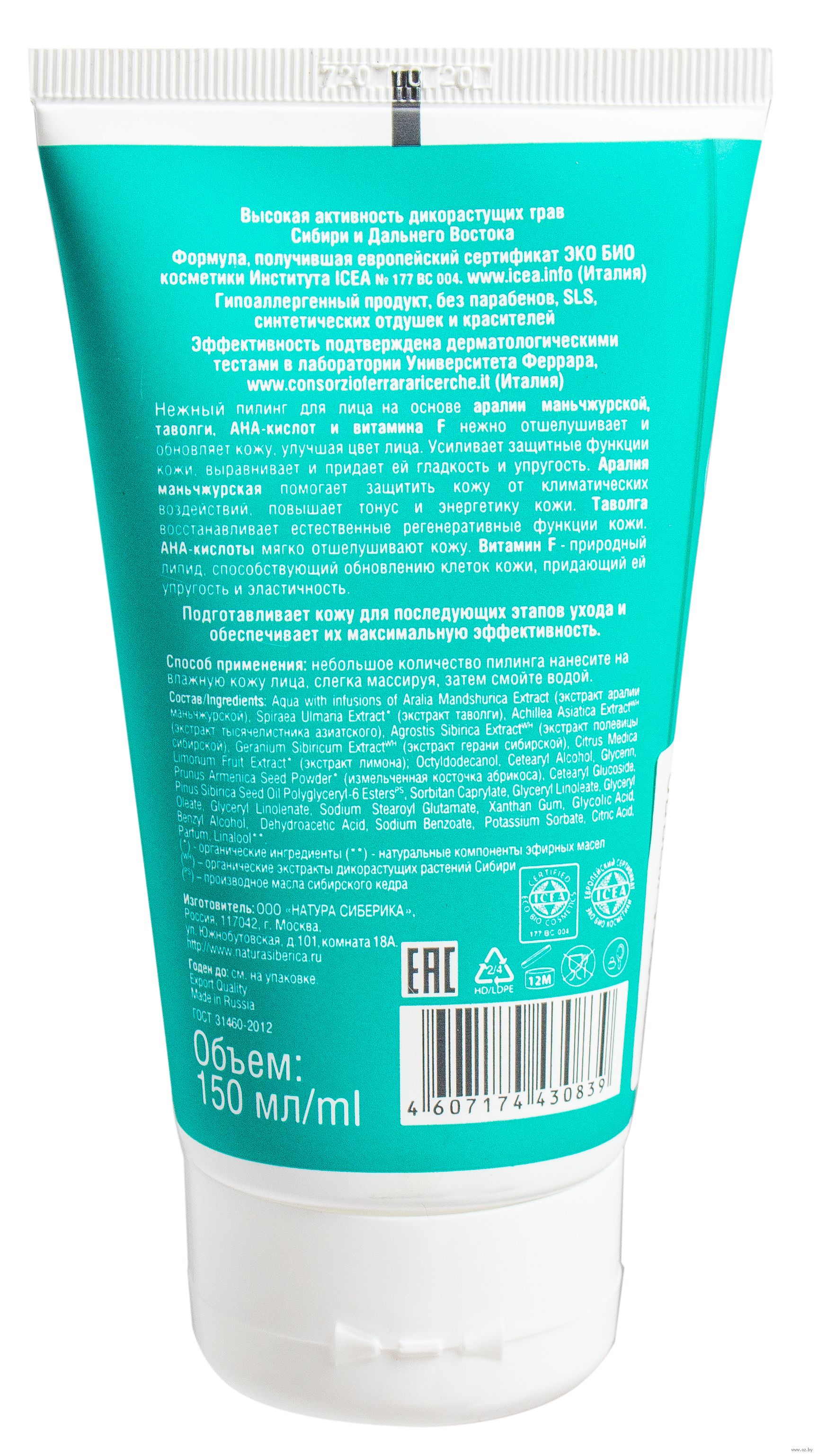 Aqua with infusions of Aralia Mandshurica Extract (экстракт аралии маньчжурской), Spiraea Ulmaria Extract (экстракт таволги), Achillea Asiatica ExtractWH (экстракт тысячелистника азиатского), Agrostis Sibirica ExtractWH (экстракт полевицы сибирской), Geranium Sibiricum ExtractWH (экстракт герани сибирской), Citrus Medica Limonum Fruit Extract (экстракт лимона); Octyldodecanol, Cetearyl Alcohol, Glycerin, Prunus Armenica Seed Powder (измельченная косточка абрикоса), Cetearyl Glucoside, Pinus Sibirica Seed Oil Polyglyceryl-6 EstersPS, Sorbitan Caprylate, Glyceryl Linoleate, Glyceryl Oleate, Glyceryl Linolenate, Sodium Stearoyl Glutamate, Xanthan Gum, Glycolic Acid, Benzyl Alcohol, Dehydroacetic Acid, Sodium Benzoate, Potassium Sorbate, Citric Acid, Parfum, Linalool.