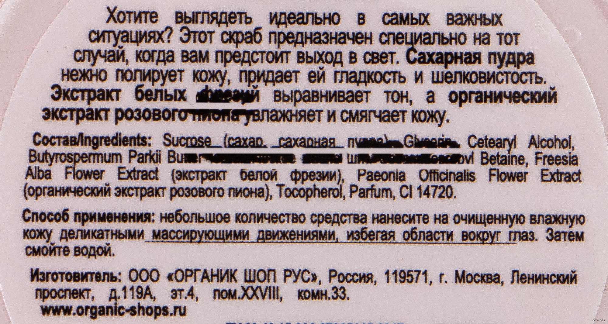 Этот скраб предназначен специально на тот случай, когда вам предстоит выход в свет. Сахарная пудра нежно полирует кожу, придает ей гладкость и шелковистость. Экстракт белых фрезий выравнивает тон, а органический экстракт розового пиона увлажняет и смягчает кожу.
