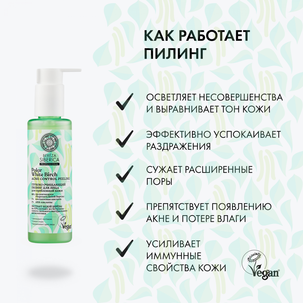 Пилинг для лица "Berёza Siberica. Глубоко очищающий" отлично справляется с акне, осветляет и борется со следами постакне, обновляет верхний слой кожи, отшелушивая и удаляя ороговевшие клетки, очищает поры, успокаивая и выравнивая тон.