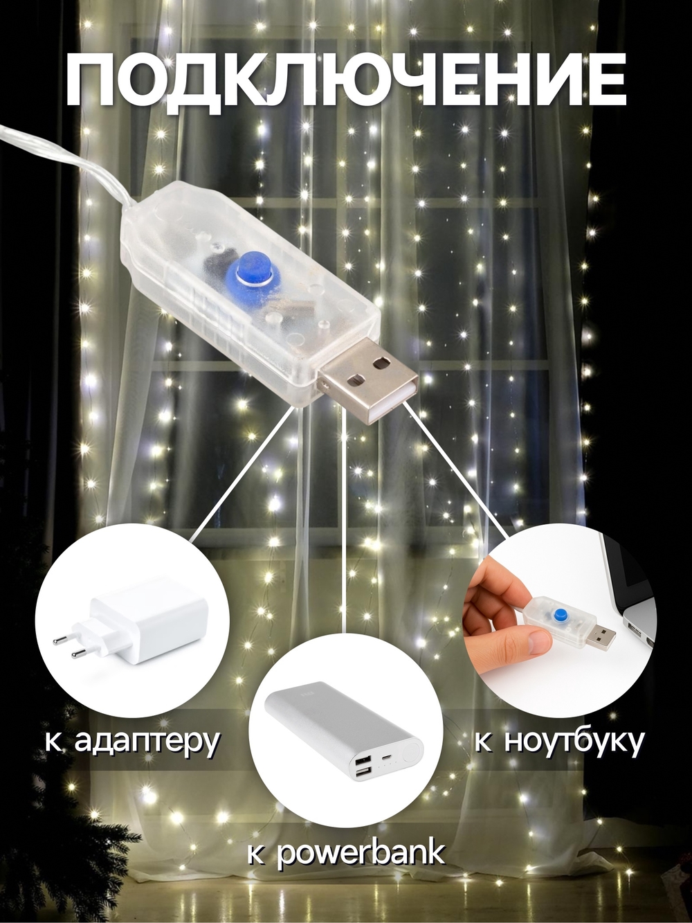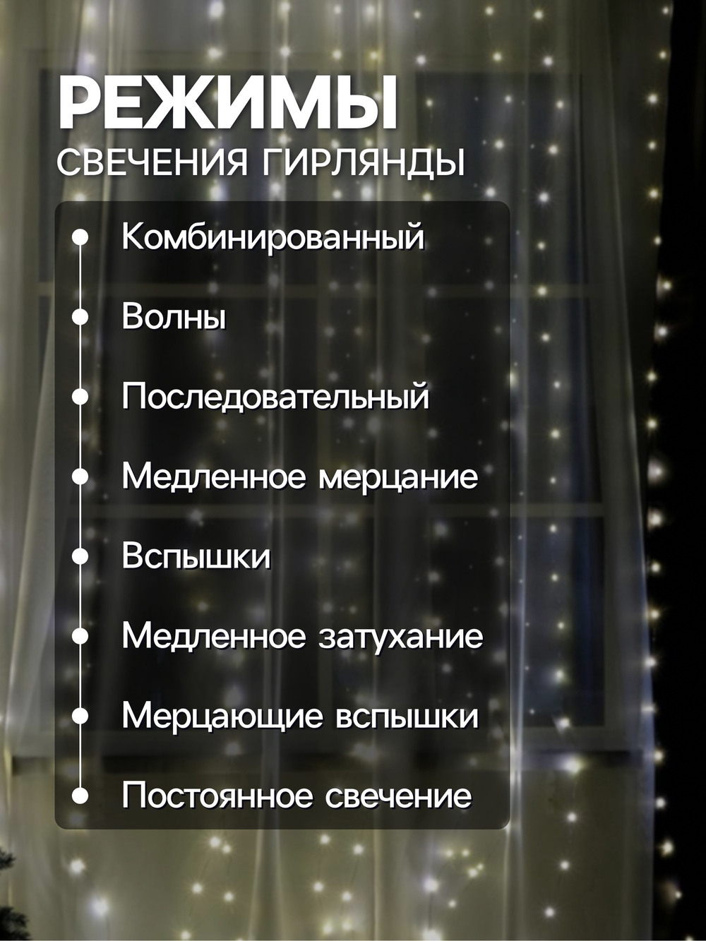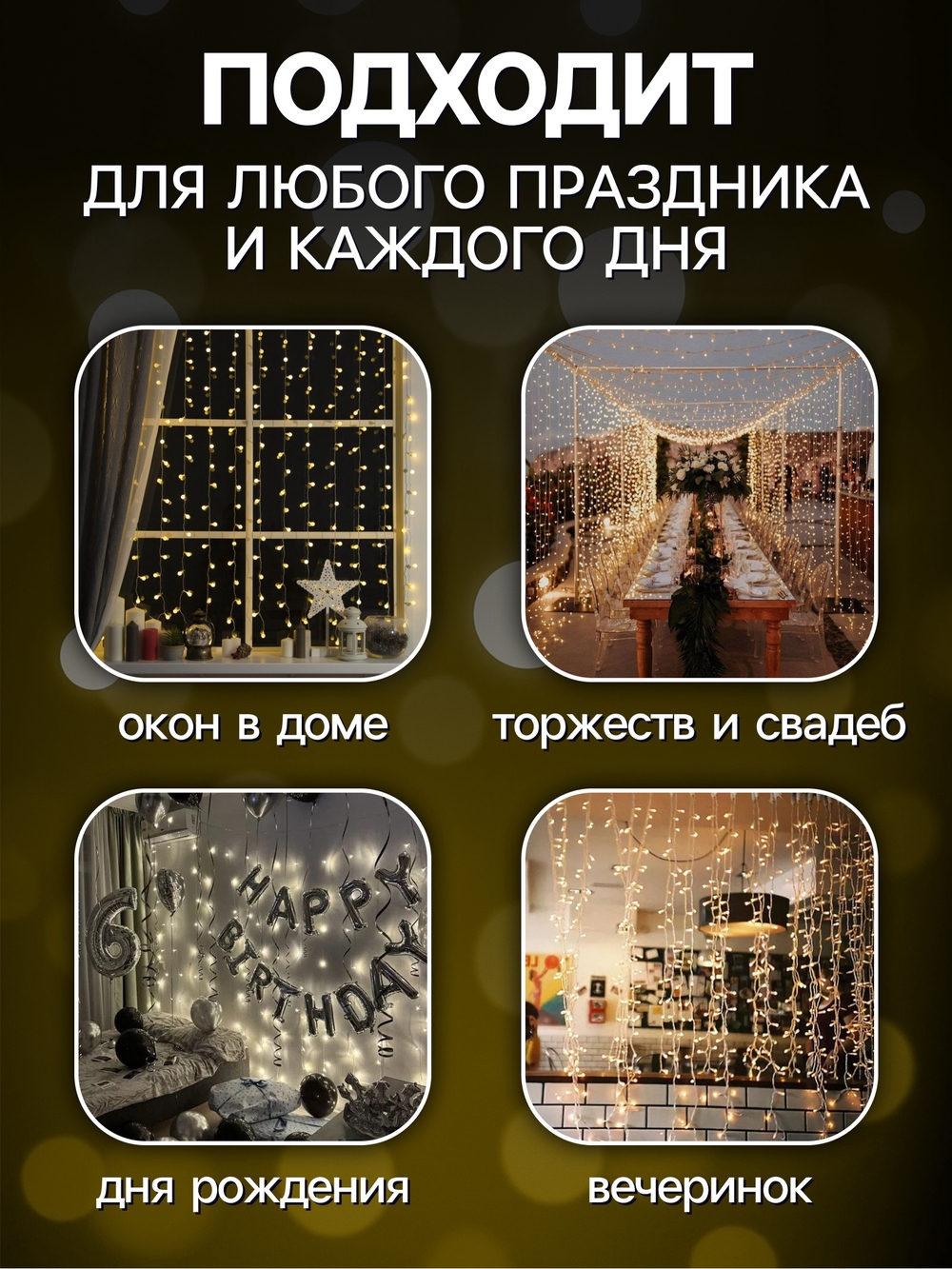 Гирлянда имеет свисающие световые нити одинаковой длины, равномерно распределённые по горизонтальной основе. Она создаёт эффект светового занавеса, который можно использовать для украшения окон, дверей и фасадов зданий.
