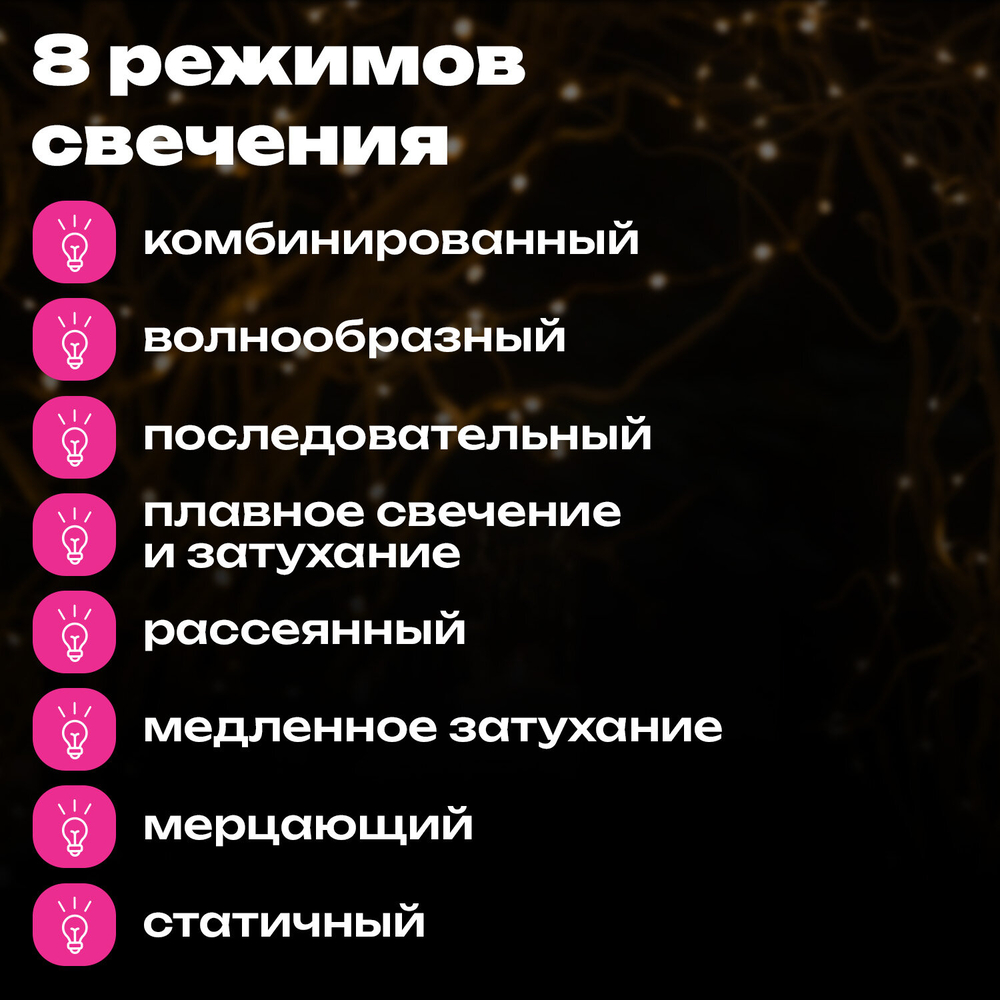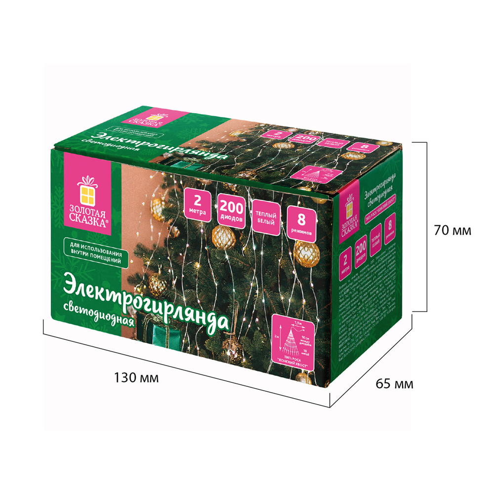 Цвет свечения гирлянды – тёплый белый. Конструкцией гирлянды предусмотрено наличие контроллера для принудительного переключения между режимами свечения. Количество режимов свечения – 8 шт.