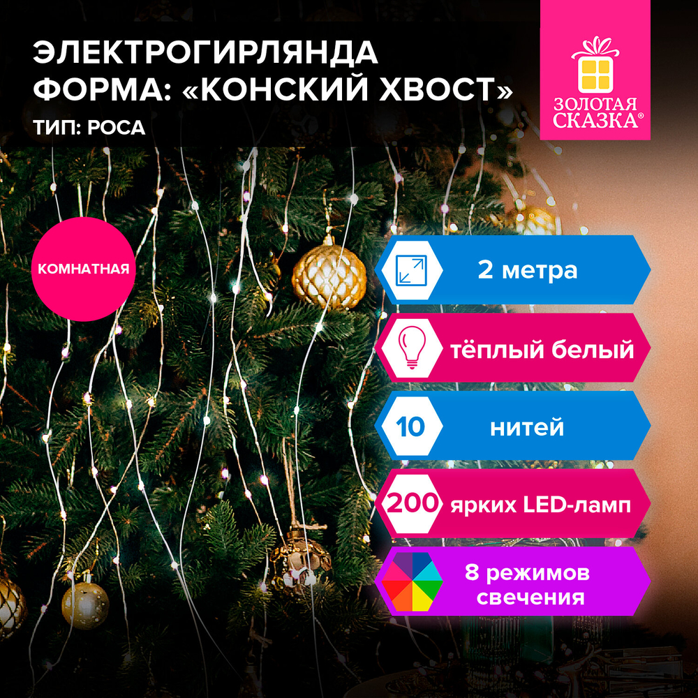 Гирлянда "Конский хвост" – это великолепное украшение для вашей новогодней ели, которое добавит уникальный шарм и волшебство в праздничную атмосферу.