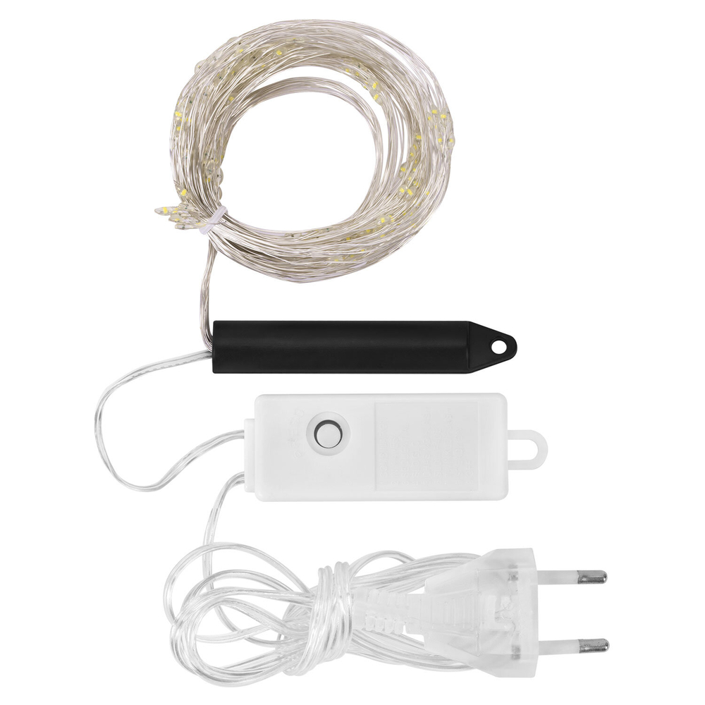 Длина рабочей части гирлянды составляет 2 м. Количество светодиодов – 200 шт. Расстояние между светодиодами – 10 см.