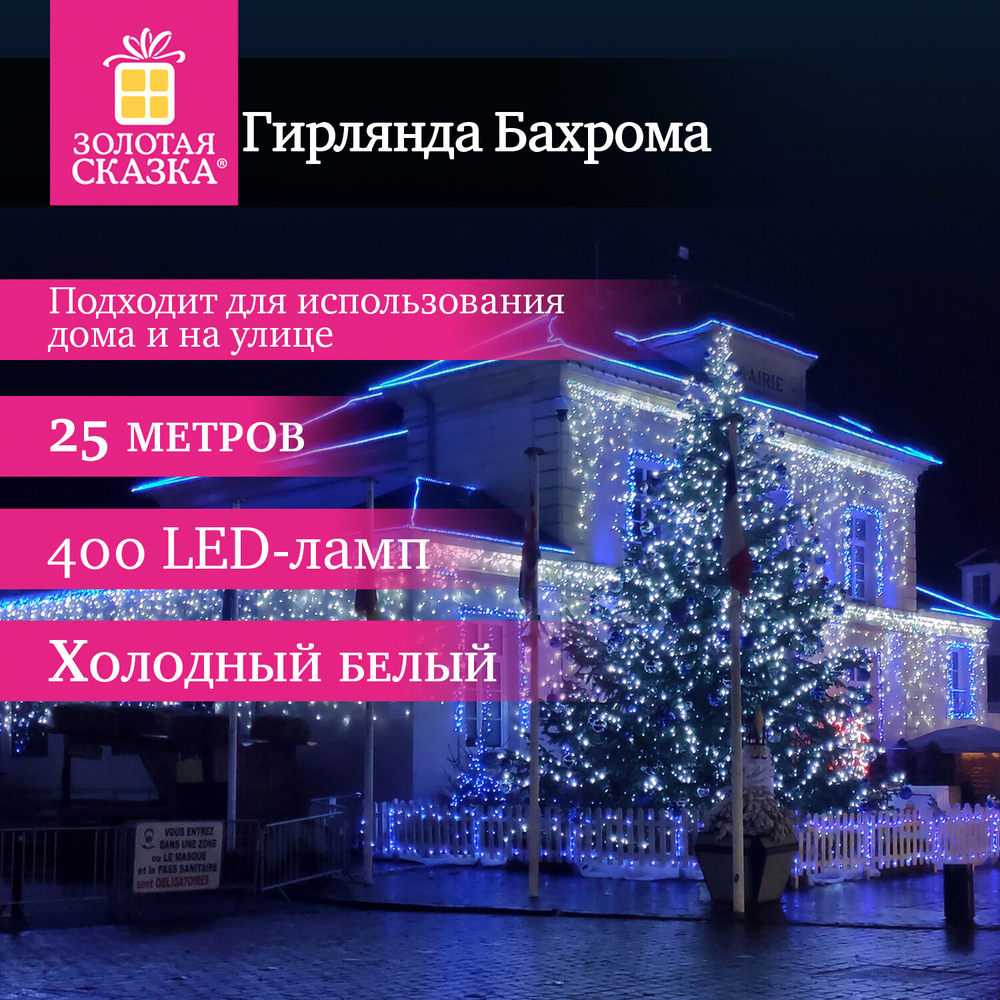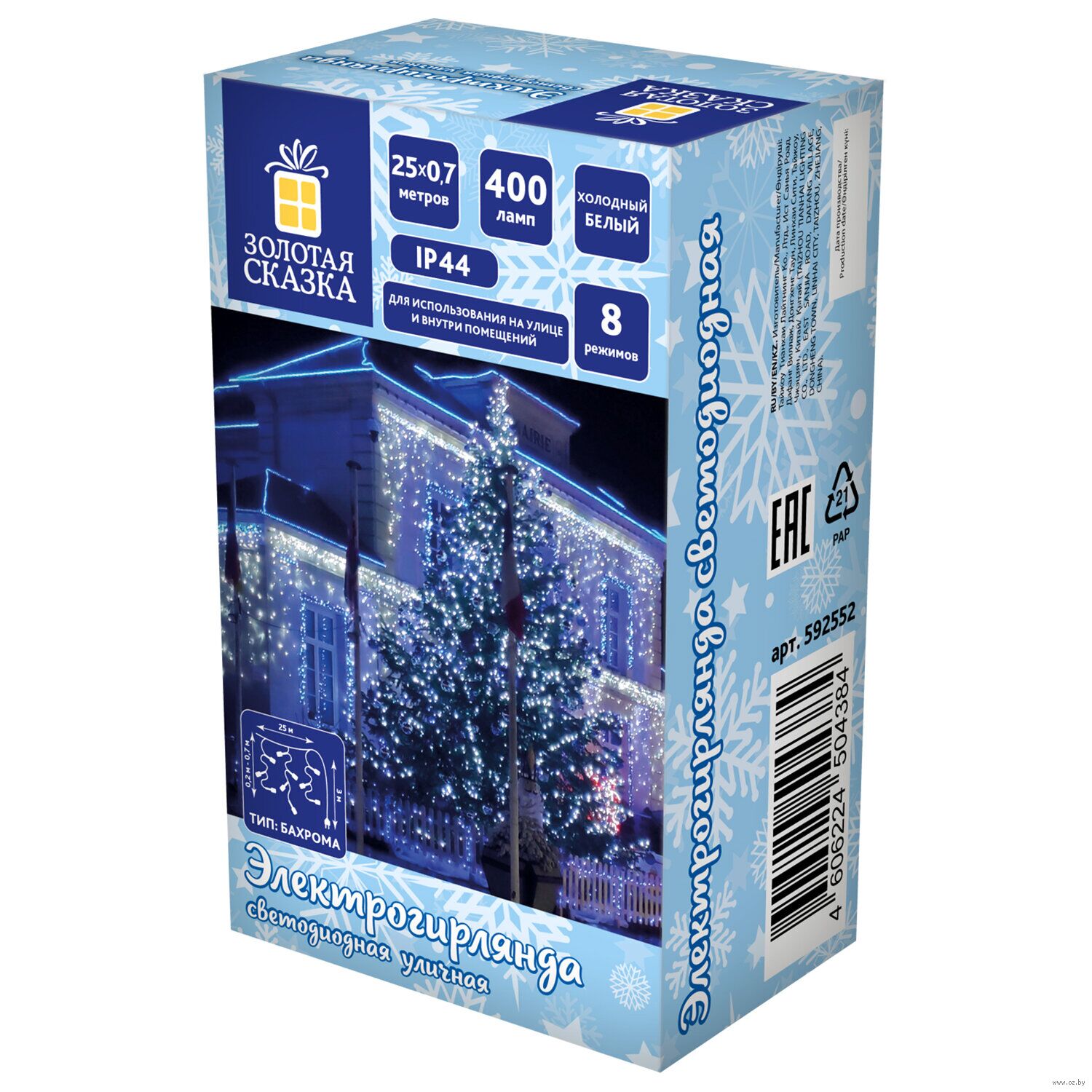 Длина основного провода рабочей части гирлянды составляет 25х0,7 м, длина кабеля питания – 3 м. Количество светодиодных ламп – 400 шт. Лампы сделаны на основе технологии LED, которая является более безопасной и эффективной по сравнению с лампой накаливания.