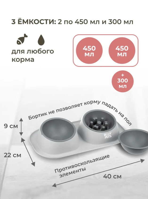 Анатомически продуманная двойная миска для питомцев с защитой от просыпания корма.