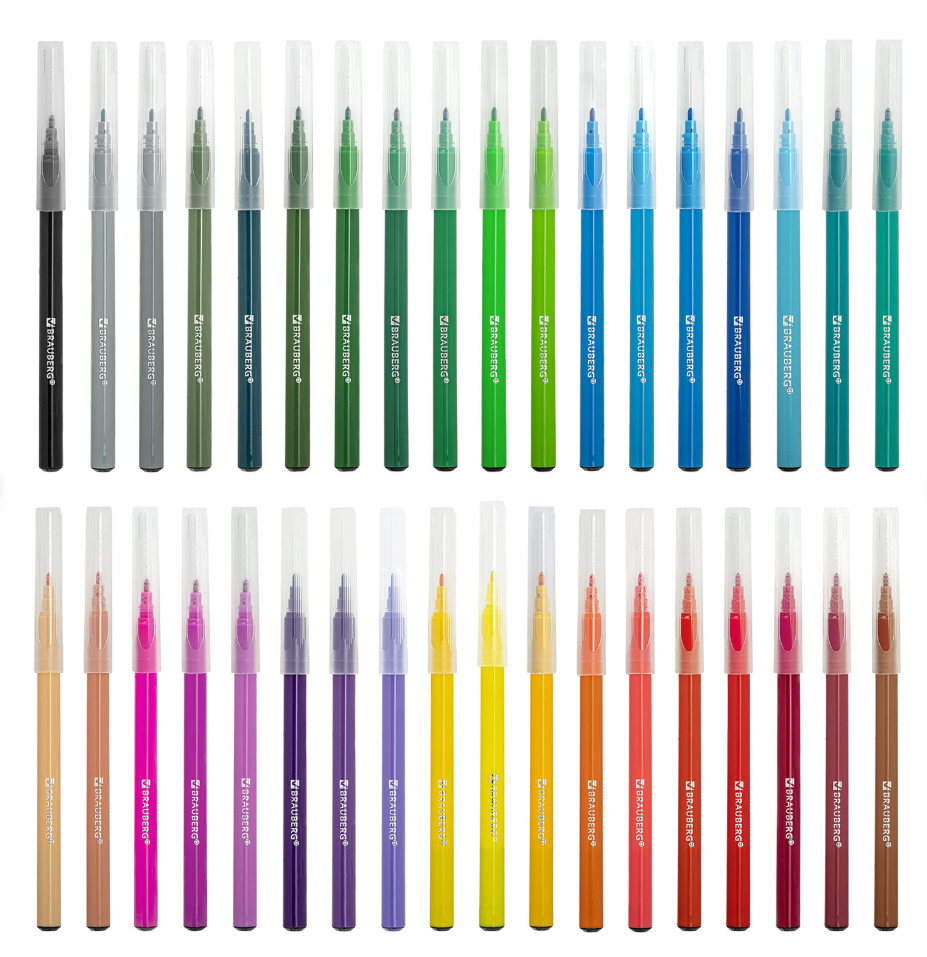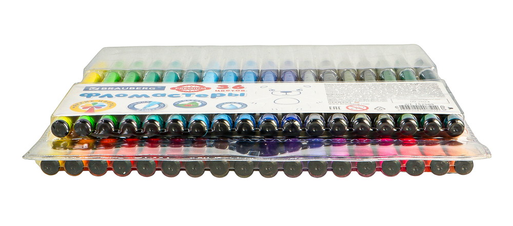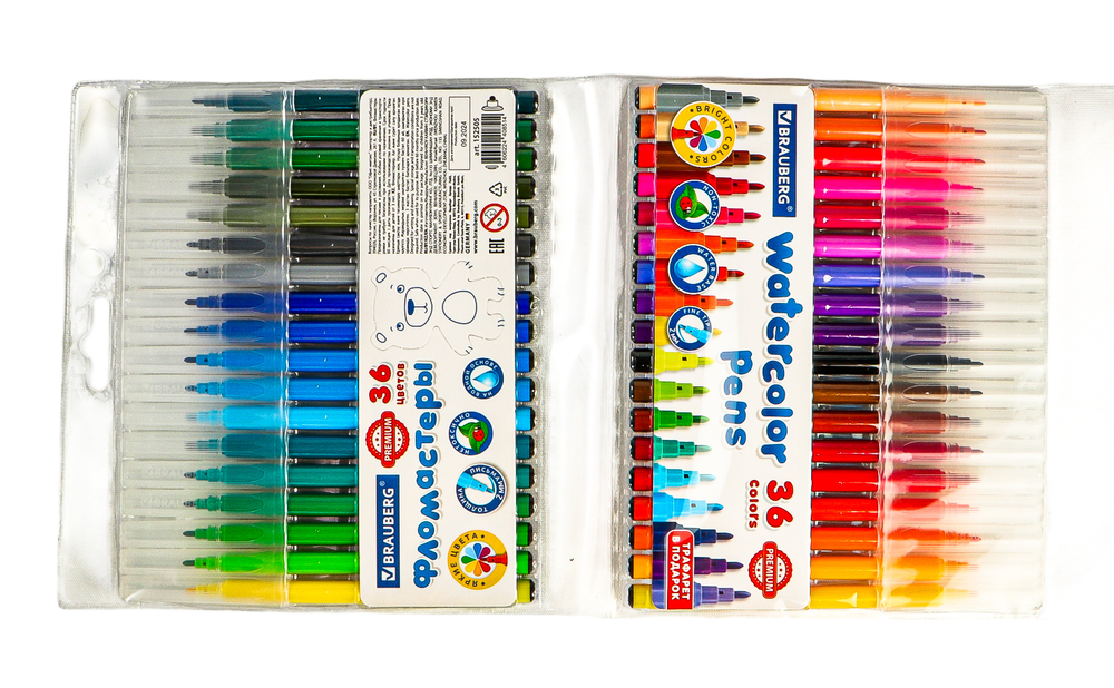В наборе 36 фломастеров с круглым корпусом из пластика длиной 150 мм и диаметром 8,2 мм. Круглый наконечник из фетра с линией письма 0,5-1 мм удобен для создания тонких линий и прорисовки деталей. Длина письма составляет 350 м – такого расхода хватит надолго.