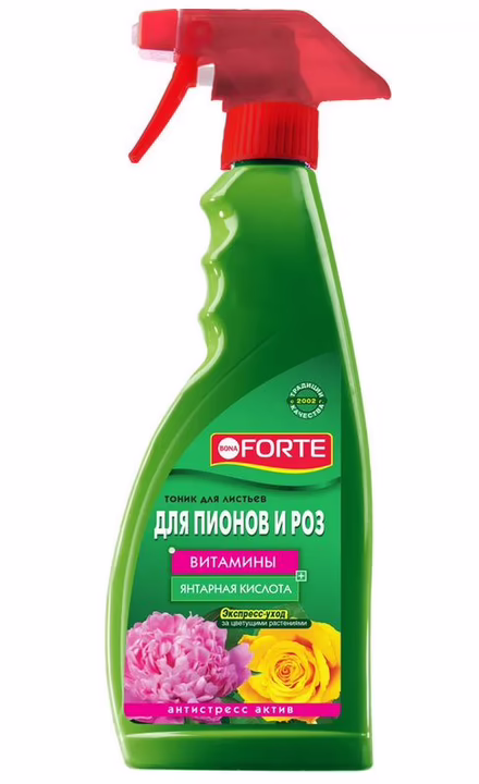 Средство создано лабораториями Bona Forte для стимулирования обильного цветения роз, пионов и других красивоцветущих растений: