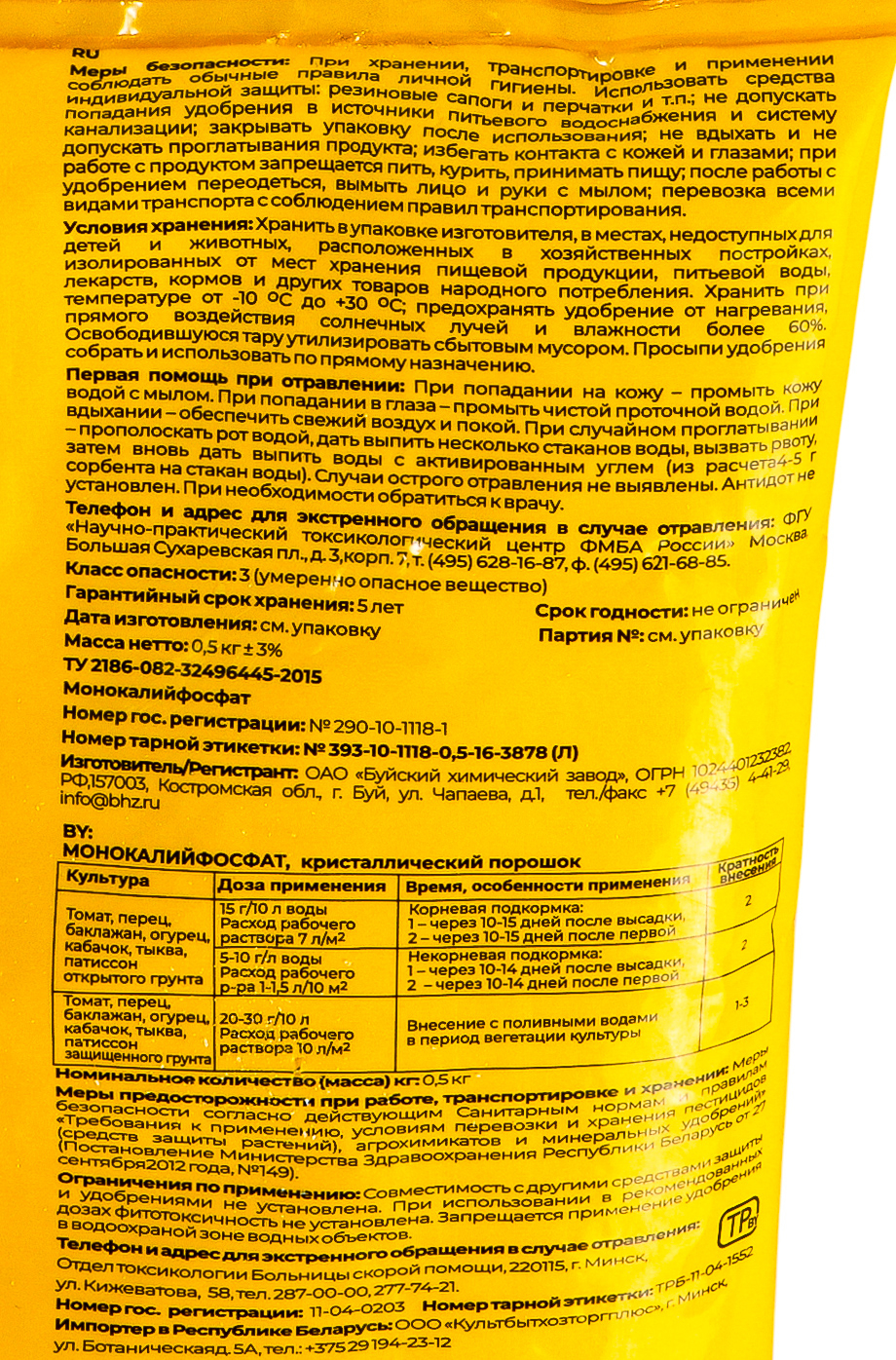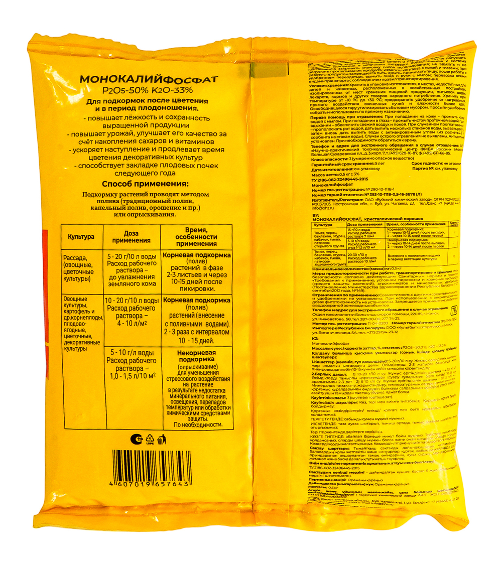 "Монокалийфосфат" – это комплексное минеральное удобрение для подкормок всех типов растений. Средство представляет собой белый кристаллический порошок. В его состав входят фосфор и калий. Растворимость – 100 %. Период применения: круглогодично.