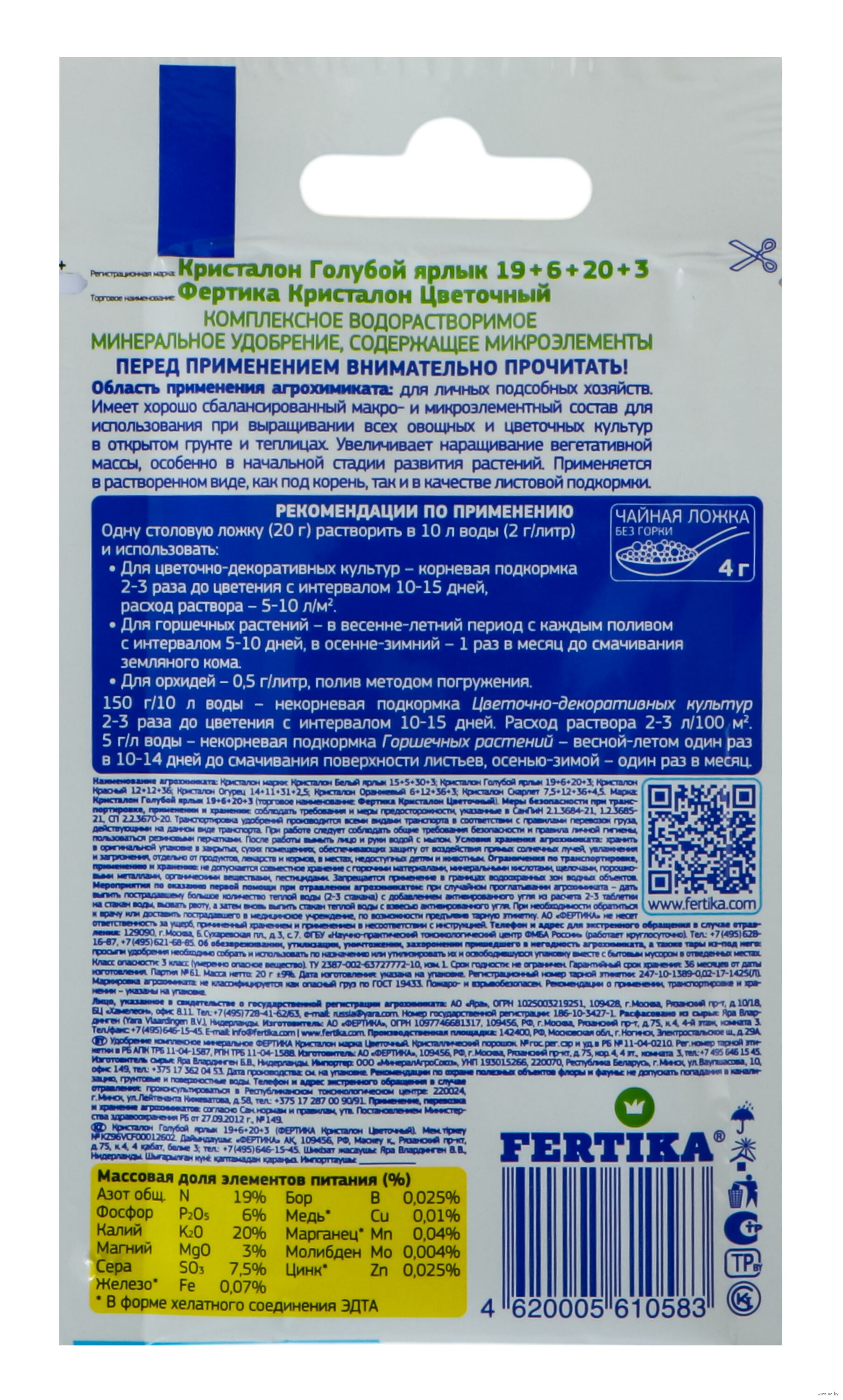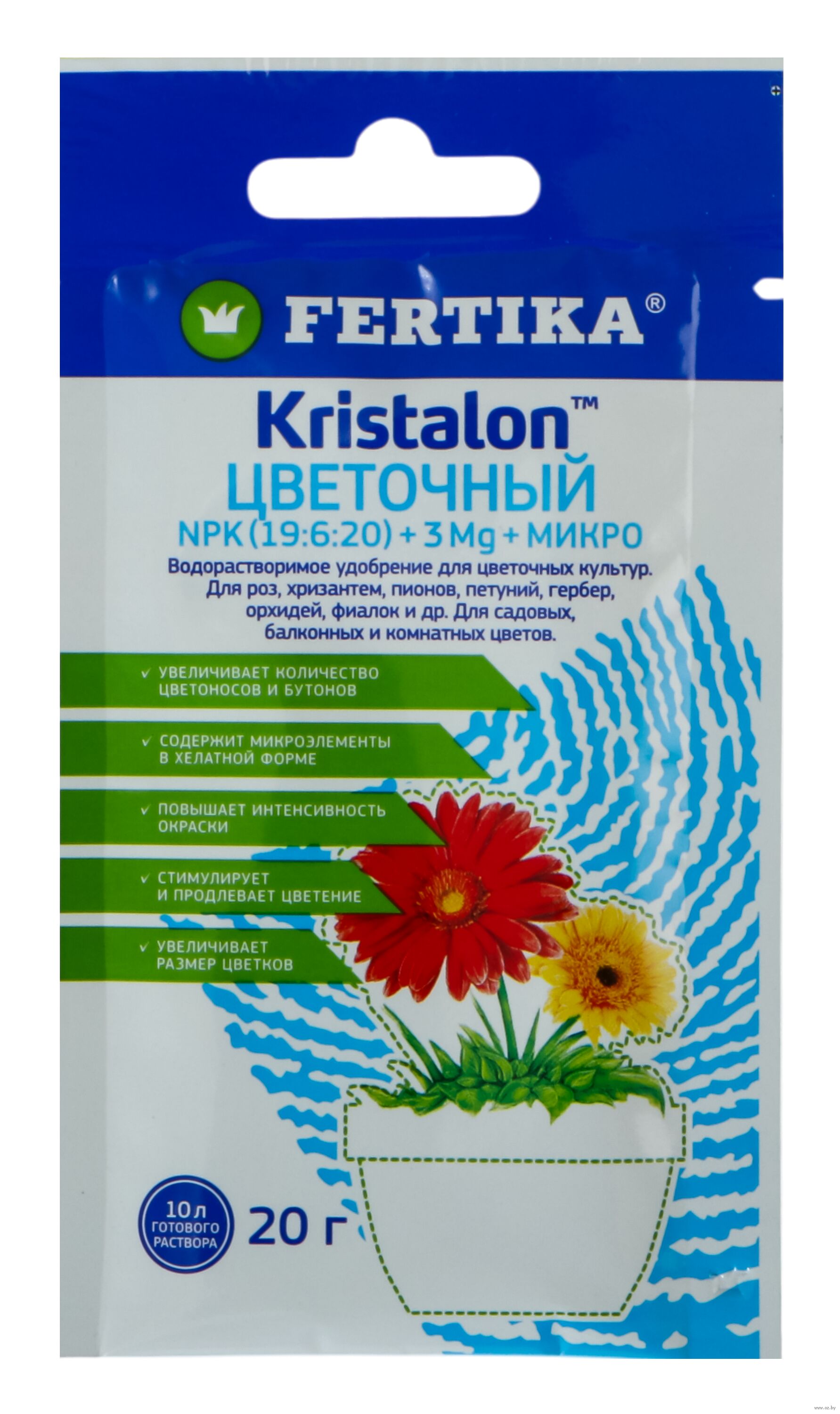 Полностью водорастворимое комплексное азотно-фосфорнокалийное удобрение, содержащее микроэлементы. Имеет хорошо сбалансированный макро- и микроэлементный состав, для использования при выращивании всех овощных и цветочных культур в открытом грунте и теплицах. Увеличивает наращивание вегетативной массы, особенно в начальной стадии развития растений.