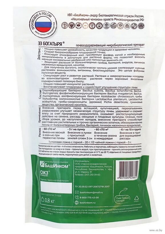 Уникальный почвооздоравливающий, оживляющий, восстанавливающий плодородие почвы микробиологический препарат. Он содержит 33 штамма полезных почвенных микроорганизмов на органическом носителе в форме гранул.
