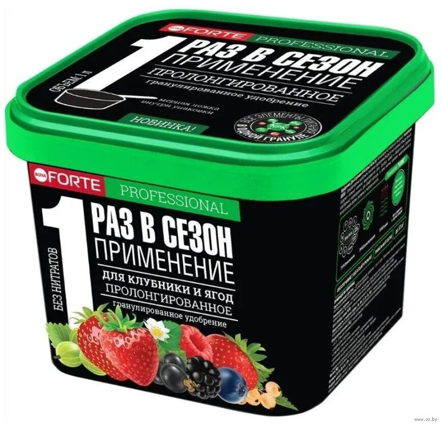 Bona Forte для клубники и ягод – гранулированное и пролонгированное минеральное удобрение с микроэлементами. Применяется для основного внесения и корневой подкормки клубники/земляники и ягодных кустарников. Удобрение усилено марганцем, стимулирует обильное плодоношение, улучшают вкусовые качества ягод, ускоряет сроки созревания и развитие растений, не содержит нитратов.