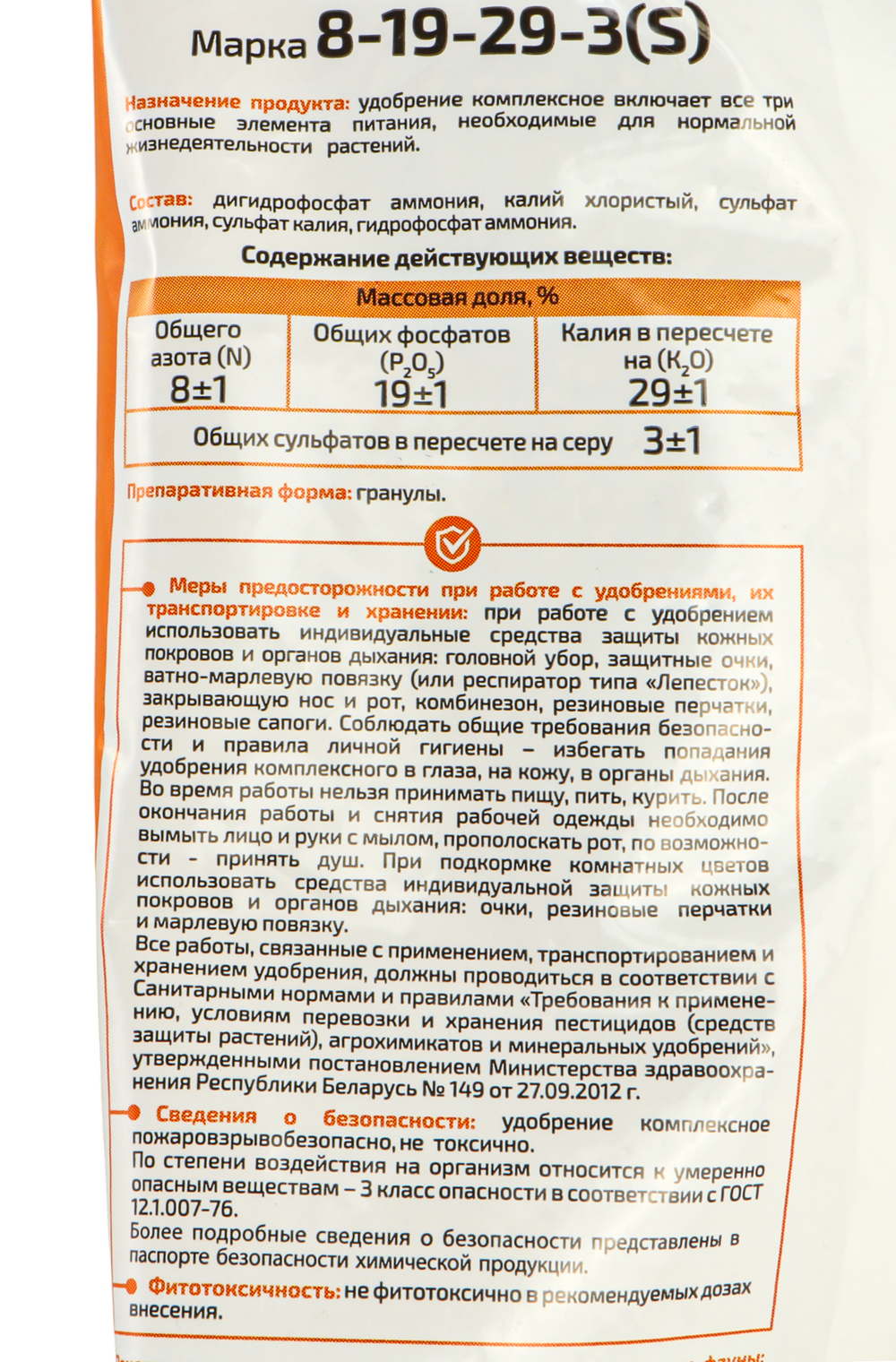 Сера (3%), калий (29%), азот (8%), фосфор (19%).Способ применения