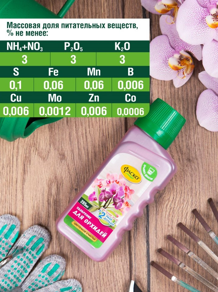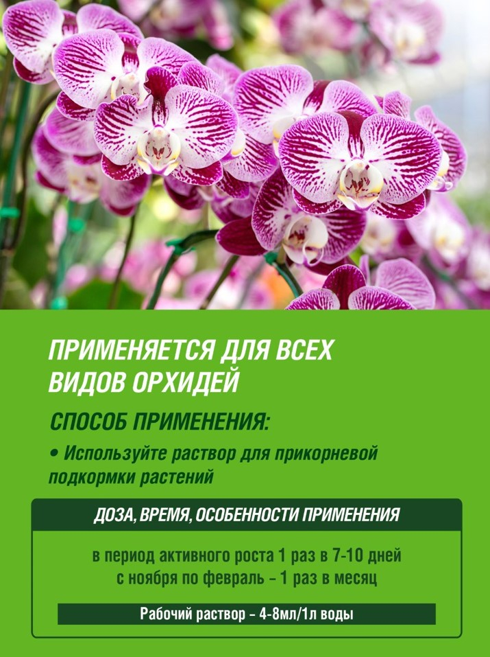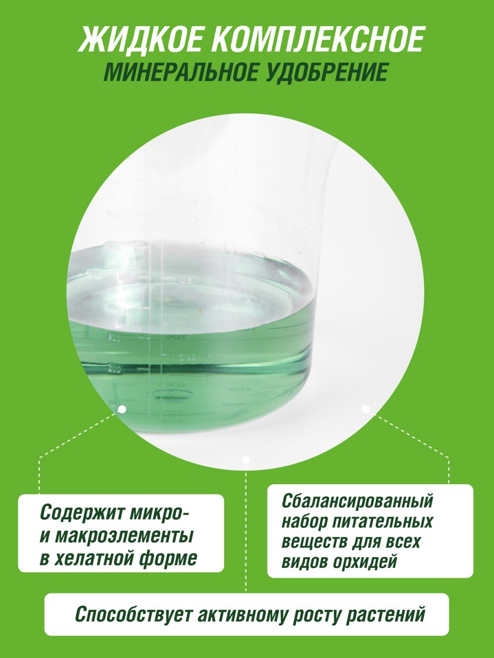 Жидкое комплексное удобрение с микроэлементами для всех видов орхидей (фаленопсиса, каттлеи, цимбидиума, мильтониопсиса, дендробиума, пафиопедилума) и других эпифитов, в т.ч. некоторых видов бромелиевых.