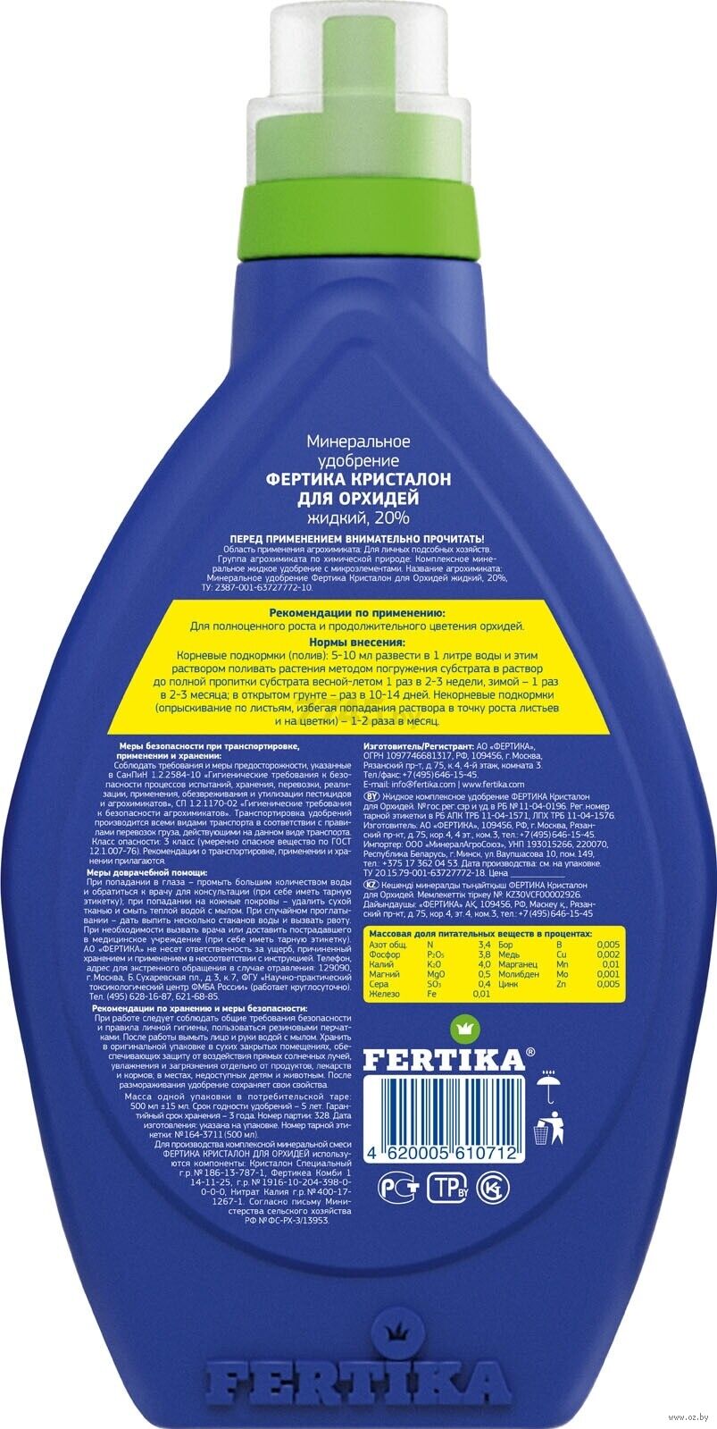 Удобрение минеральное FERTIKA Кристалон для орхидей 500 мл для всех видов орхидей. Обеспечивает полноценный рост, продолжительное цветение и яркость окраски цветов. Продлевает срок службы грунта горшечных культур.
