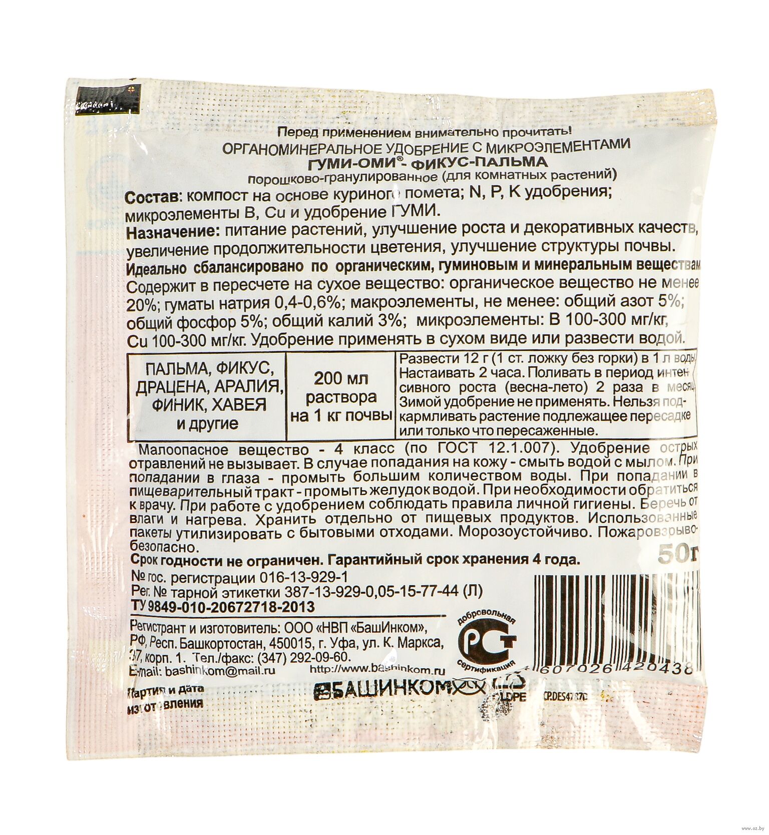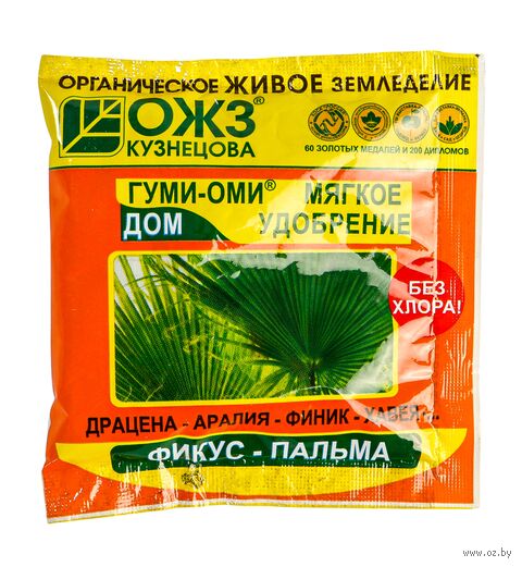 Удобрение сухое ОЖЗ Гуми-Оми является органоминеральной добавкой, использующейся для подкормки фикусов и пальм.