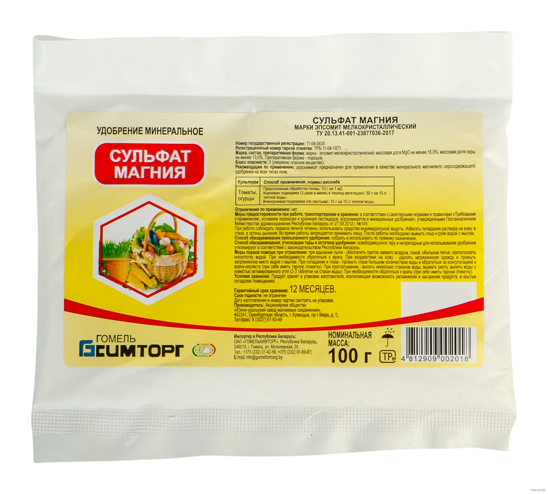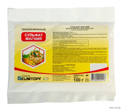 Удобрение Сульфат магния ЭПСОМИТ 0.1кг – мелкокристаллический, содержание MgSO4 не менее 48%, комплексное минеральное магниевое серосодержащее удобрение (MgO – 16,3%; S – 13%), незаменимое в растениеводстве. Используется на всех типах почв для оптимизации содержания магния и серы в почве, создания оптимального соотношения кальция и магния при нейтрализации избыточной кислотности, повышения плодородия почвы.