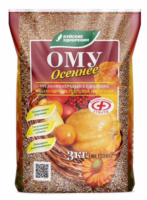 Органоминеральное удобрение "Осеннее". Применяется для внесения под огородные, садовые и декоративные культуры на любых почвах. Состав: Азот 2%, Фосфор 5%, Калий 10%, Магний 1.5%, массовая доля гуминовых соединений 2.9%, Марганец 0.07%, медь 0.01%, Цинк 0.01%, Бор 0.02%.Способ применения