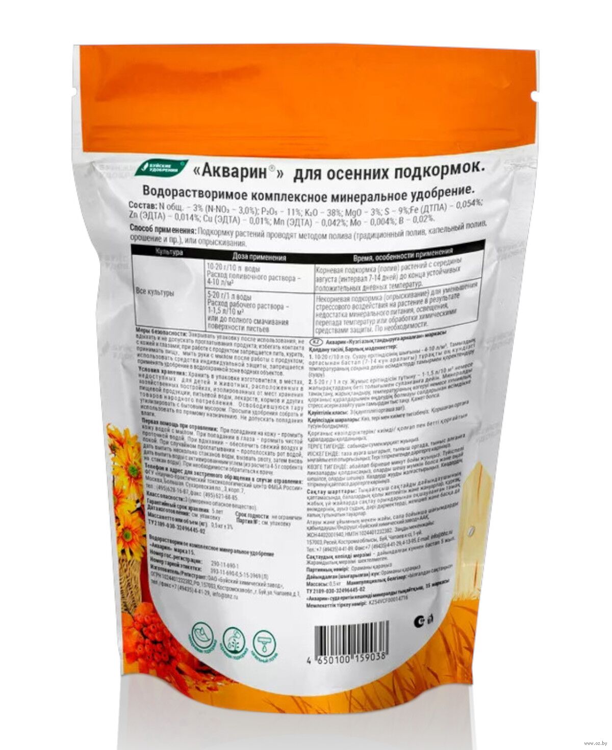 "Акварин" для осенних подкормок – водорастворимое удобрение, в состав которого входит азот, фосфор, калий, магний, сера и микроэлементы – железо, цинк, марганец, медь в хелатной форме, а бор и молибден – в минеральной. Благодаря кислой реакции (рН) удобрения, оно легко растворяется в холодной воде и более эффективно усваивается корневой системой или листовой поверхностью растений.