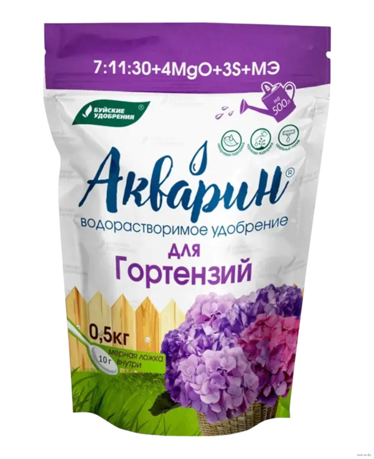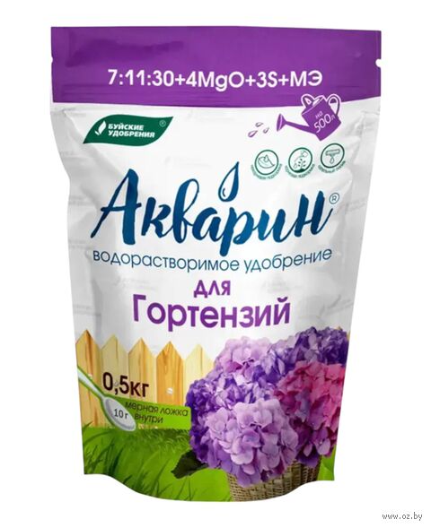 "Акварин" для гортензий – водорастворимое удобрение, в состав которого входит азот, фосфор, калий, магний, сера и микроэлементы – железо, цинк, марганец, медь в хелатной форме, а бор и молибден – в минеральной. Благодаря кислой реакции (рН) удобрения, оно легко растворяется в холодной воде и более эффективно усваивается корневой системой или листовой поверхностью растений.