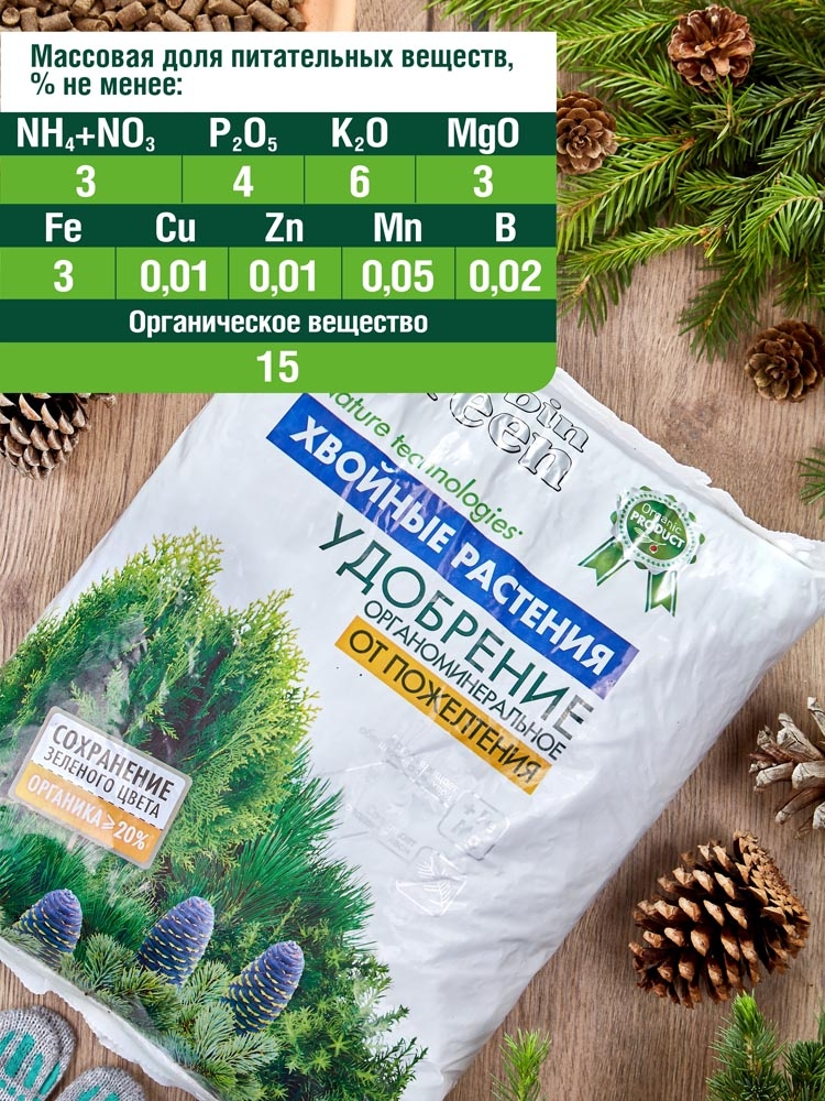 Кроме макро- и микроэлементов в состав удобрения входят железо (Fe) и магний (Mg), которые предотвращают обесцвечивание хвои.