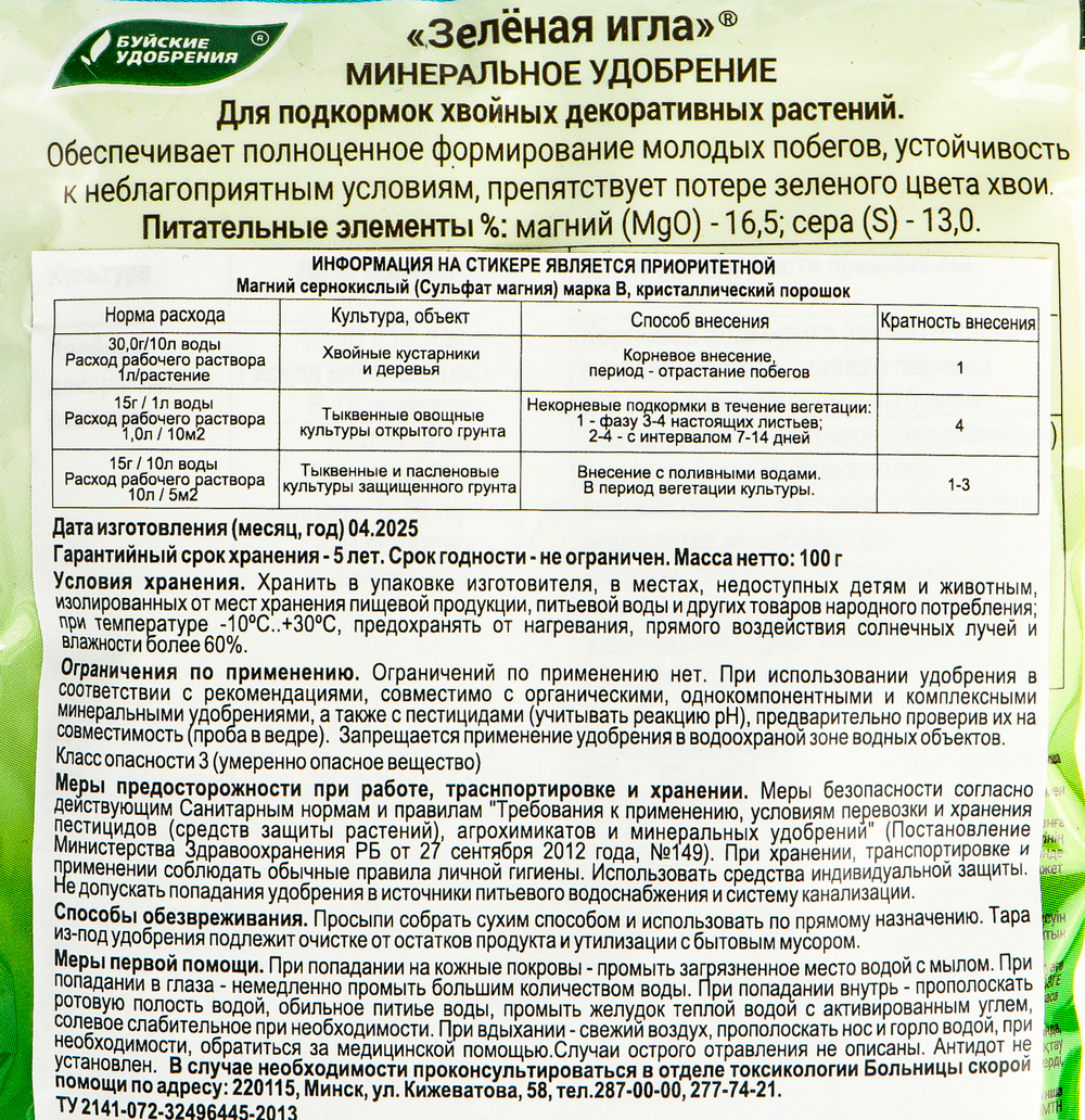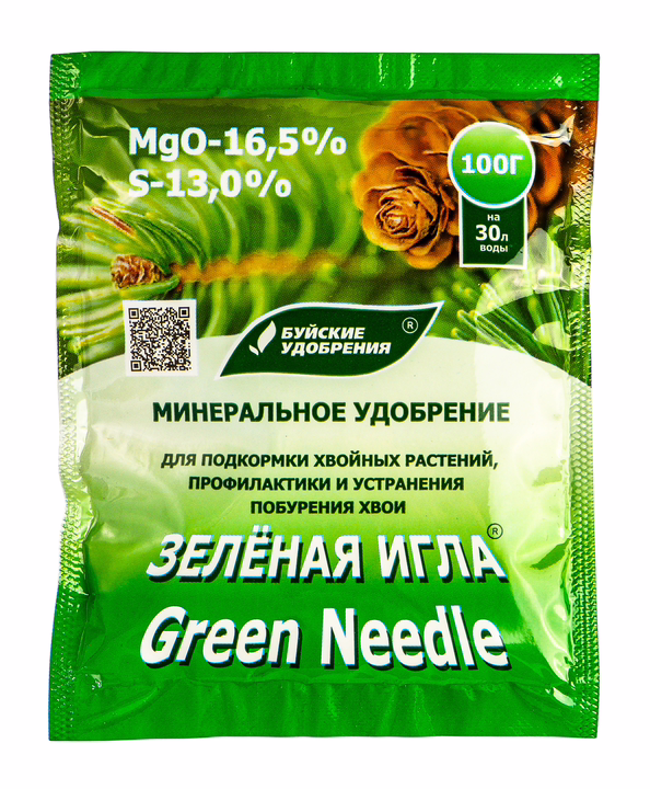 Гранулированное удобрение "Зелёная игла" – удобрение для подкормок хвойных растений, водорастворимое. Средство для устранения и профилактики побурения хвои, вызванной недостатком магния. Гранулы полусферической формы белого цвета с жёлтым оттенком.