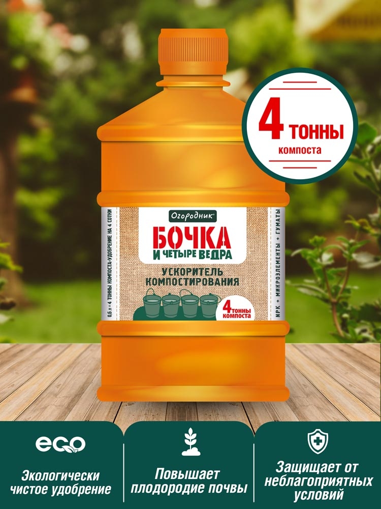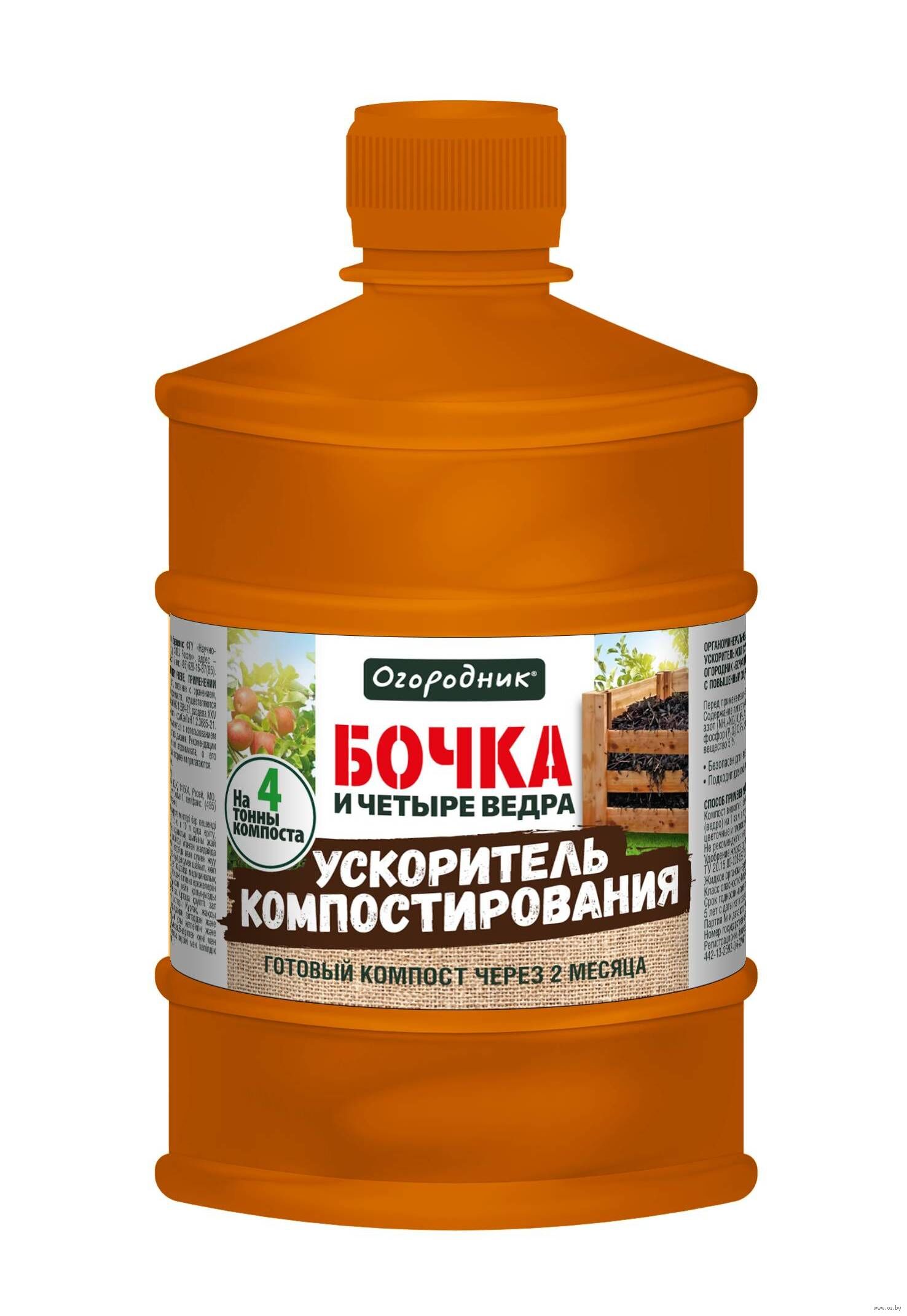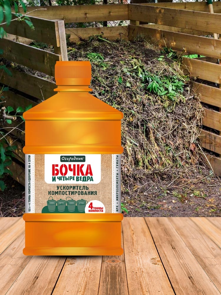 Жидкое средство, которое применяется для ускорения процесса приготовления компоста. Одного литра ускорителя достаточно для того, чтобы получить 4т компоста, которого достаточно для удобрения 6 соток огорода. В состав средства не входит хлор. Для получения компоста годятся любые органические остатки.