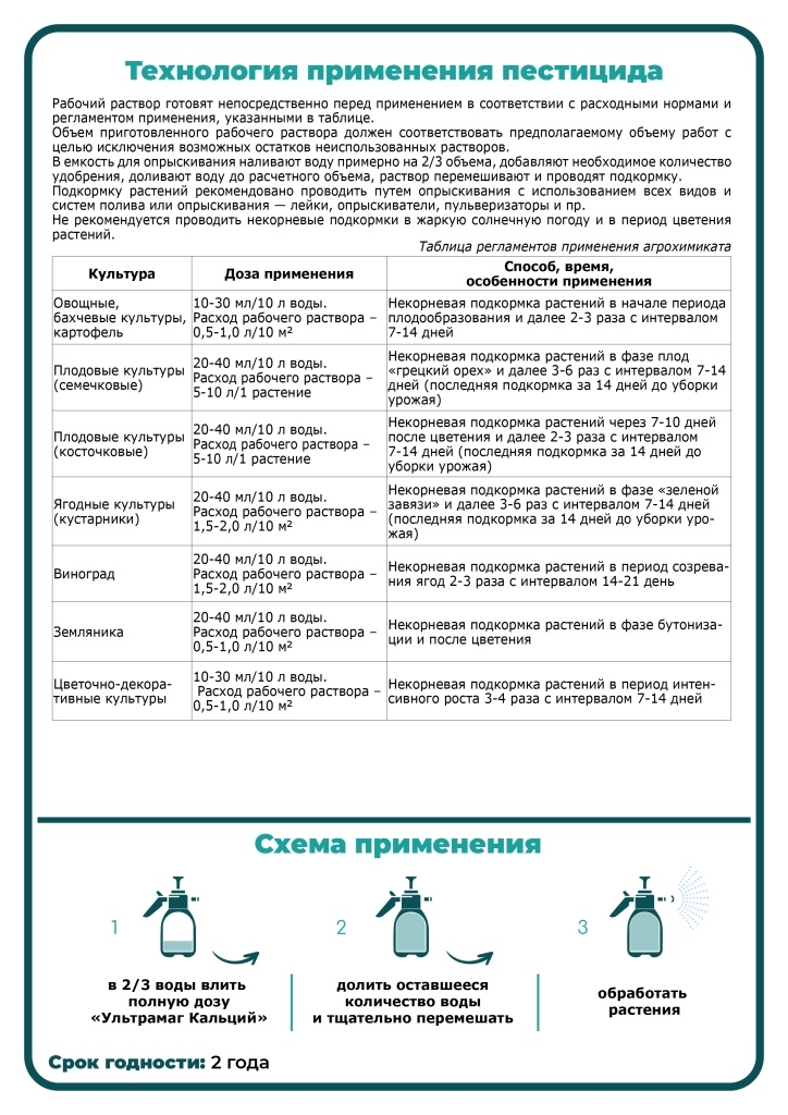 "Ультрамаг Кальций" используется для подкормок любых культур – овощных, косточковых и семечковых плодовых, ягодных и цветочно-декоративных.