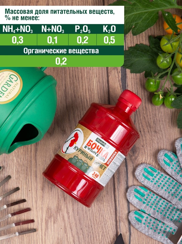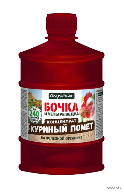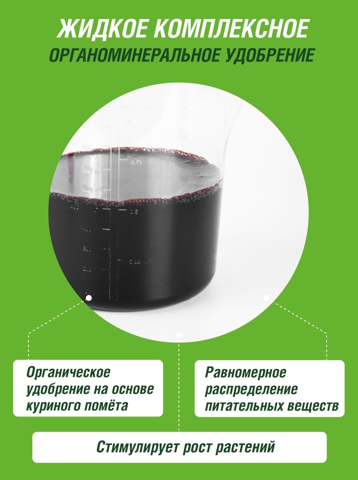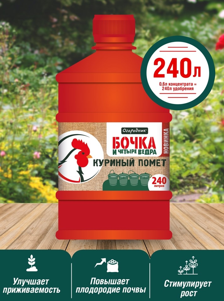 Органическое удобрение на основе куриного помёта для подкормок овощных, плодовых, ягодных и декоративно-цветочных культур. Обеспечивает равномерное распределение питательных веществ 0,6 л концентрата = 240 л удобрения.