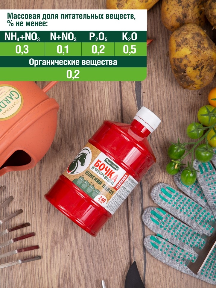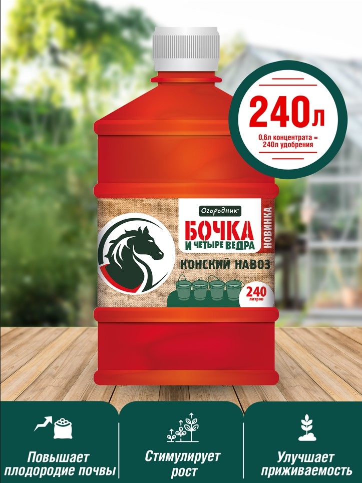 Конский навоз является одним из лидеров по содержанию питательных элементов среди органических удобрений, а компосты на его основе входят в число наиболее ценных продуктов. В сравнении с куриным пометом удобрения на его основе отличаются более мягким действием на растения и прекрасно подходят для подкормки растений в весенний, летний и осенний период. Удобрение Бочка и четыре ведра