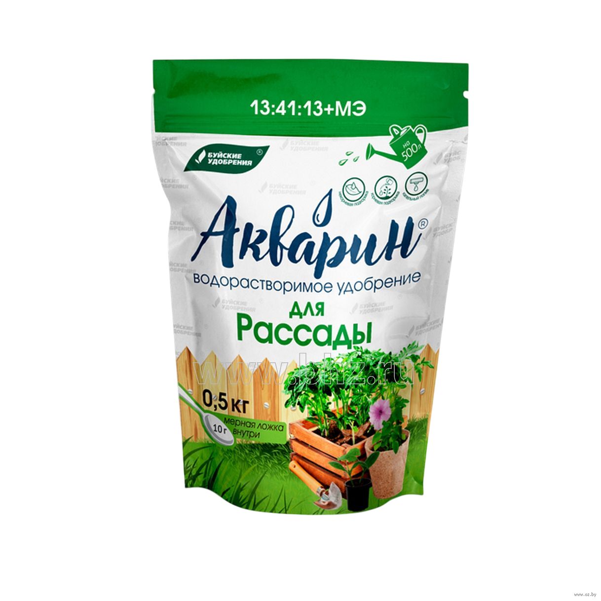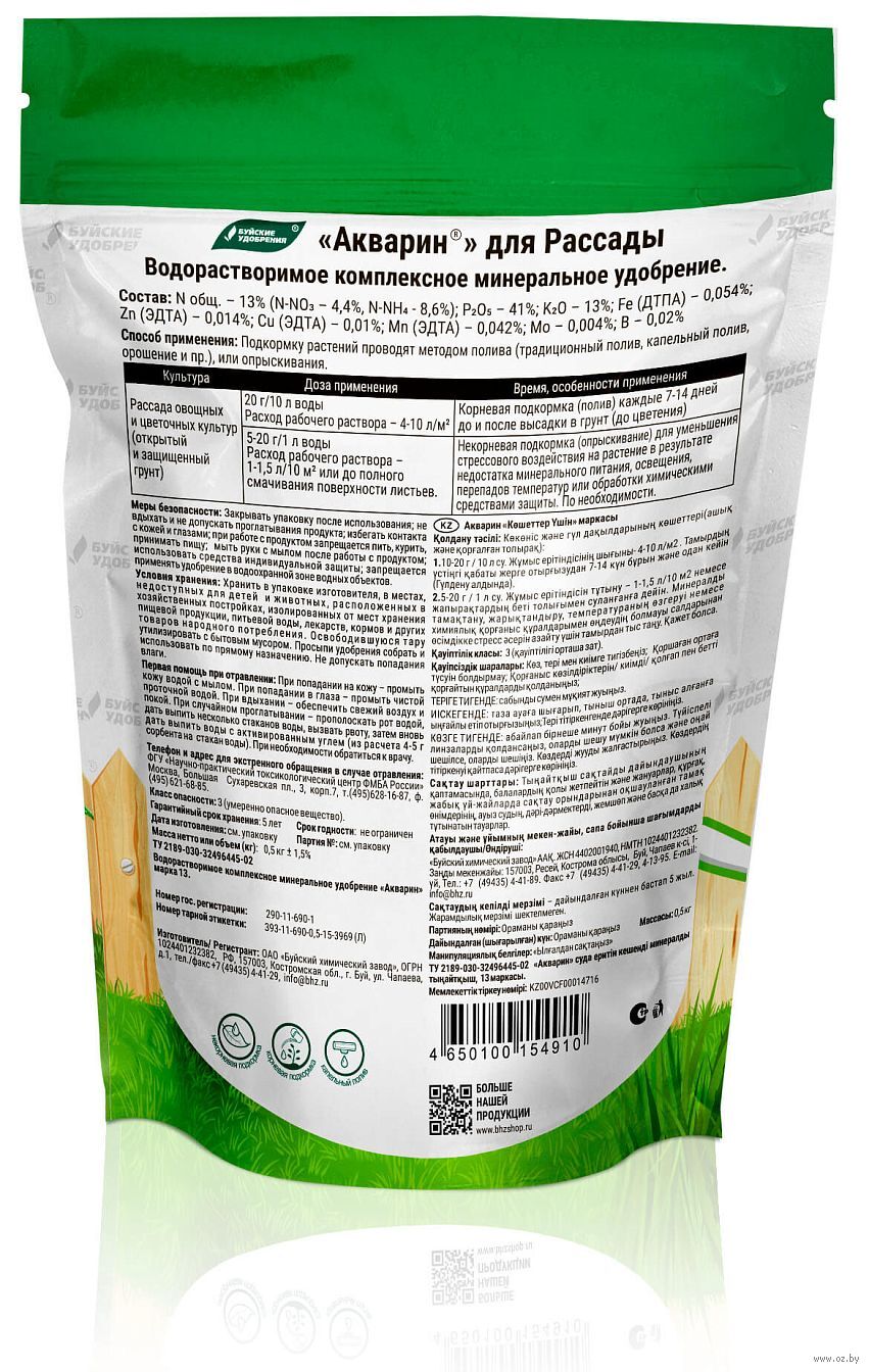 "Акварин" для рассады – водорастворимое удобрение, в состав которого входит азот, фосфор, калий и микроэлементы – железо, цинк, марганец, медь в хелатной форме, а бор и молибден – в минеральной. Благодаря кислой реакции (рН) удобрения, оно легко растворяется в холодной воде и более эффективно усваивается корневой системой или листовой поверхностью растений.