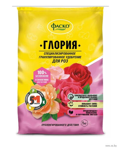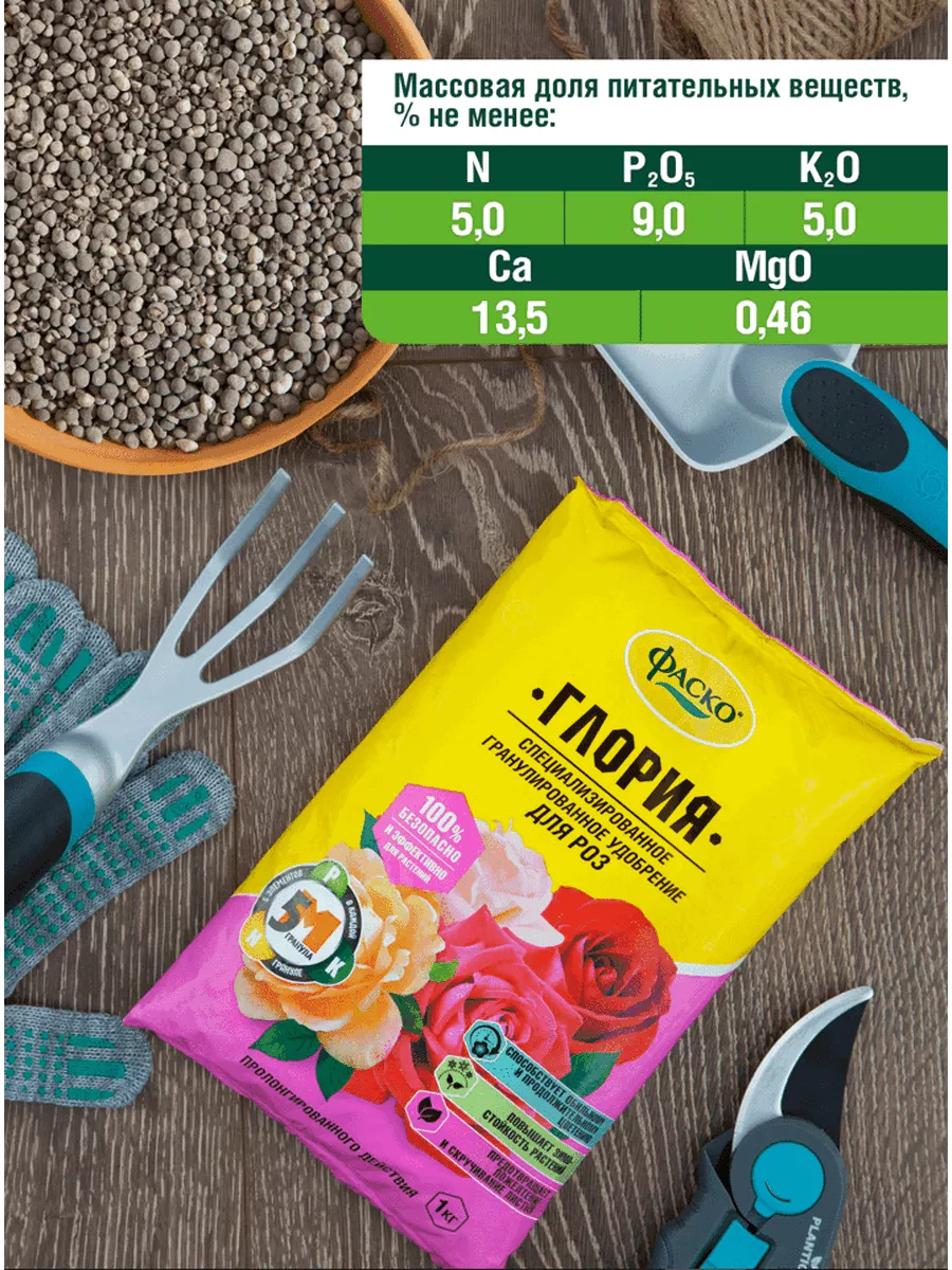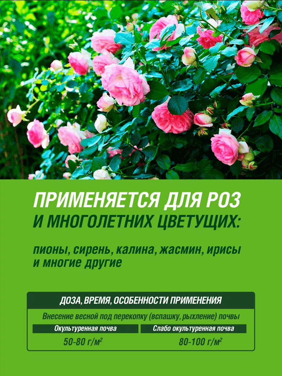 Применяется для ухода за многолетними цветочными культурами: розами, пионами, сиренью, жасмином и многими другими. Способствует полноценному росту и развитию растений, продлению периода цветения, обеспечению и поддержанию яркости окраса лепестков.