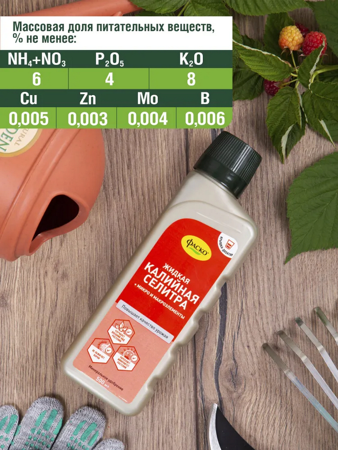 Удобрение жидкое "Калийная селитра" минеральное – комплексная добавка, предназначенная для подкормки, плодово-овощных, цветочных и декоративных растений.