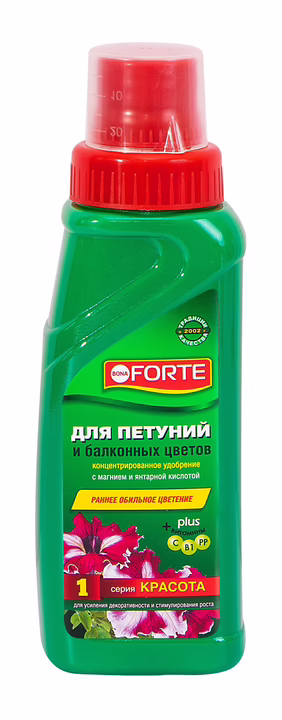 Серия КРАСОТА создана лабораториями Bona Forte для усиления декоративности и стимулирования роста растений. Подходит для петуний всех сортов и расцветок, а также для анютиных глазок, ампельных фуксий, бархатцев, вербены, герани, лобелии. Удобрение содержит полный комплекс веществ, необходимых для полноценного и сбалансированного питания растений.
