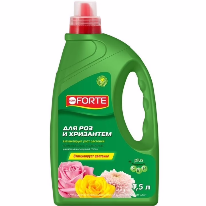Стимулирует повторную бутонизацию, способствует продолжительному цветению, делает яркими и сочными лепестки соцветий.