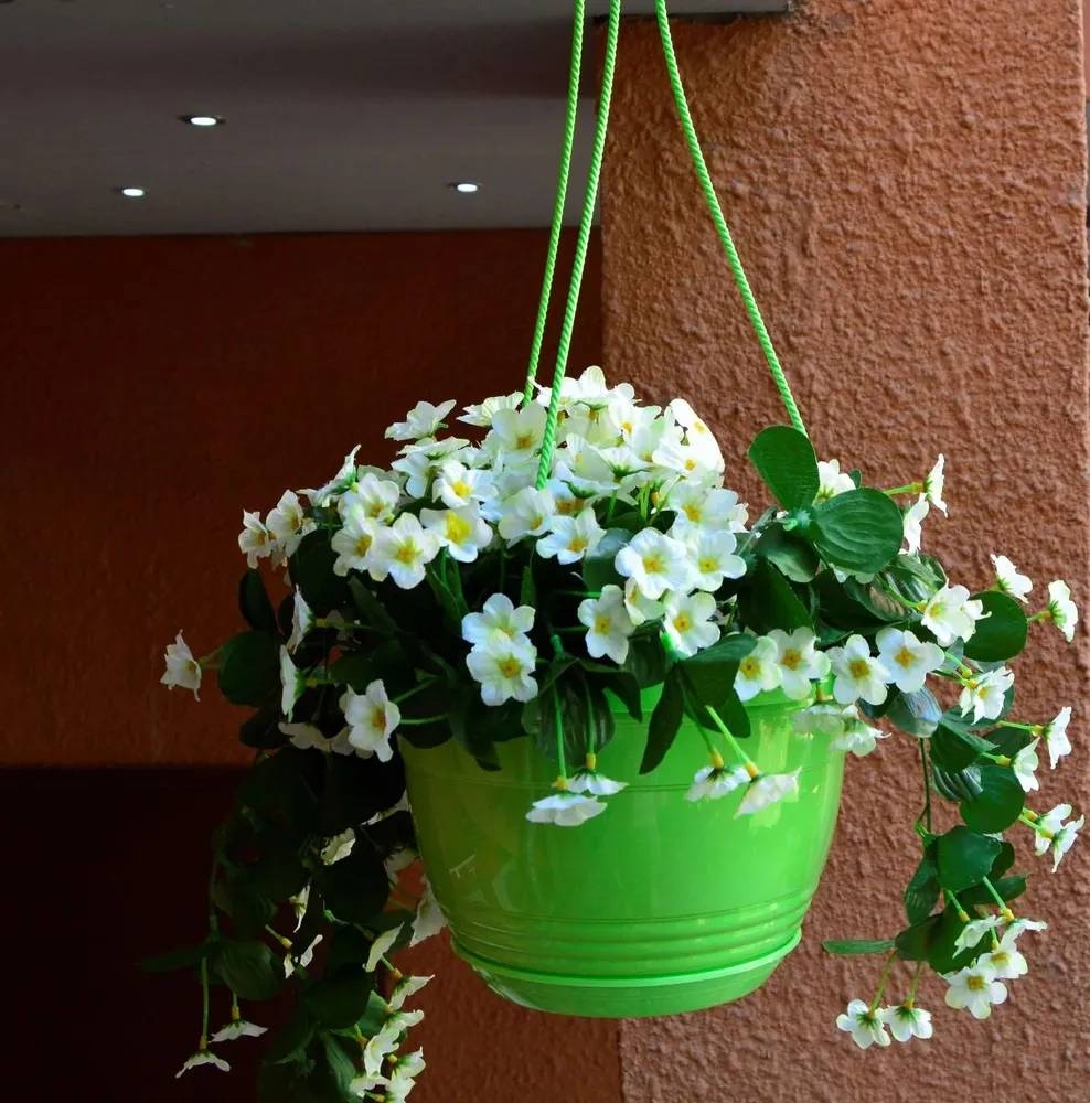 Красиво смотрятся ампельные растения, изящно свисающие с кашпо, или образуя огромный цветущий шар.