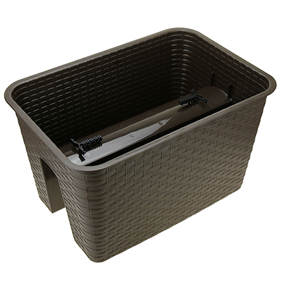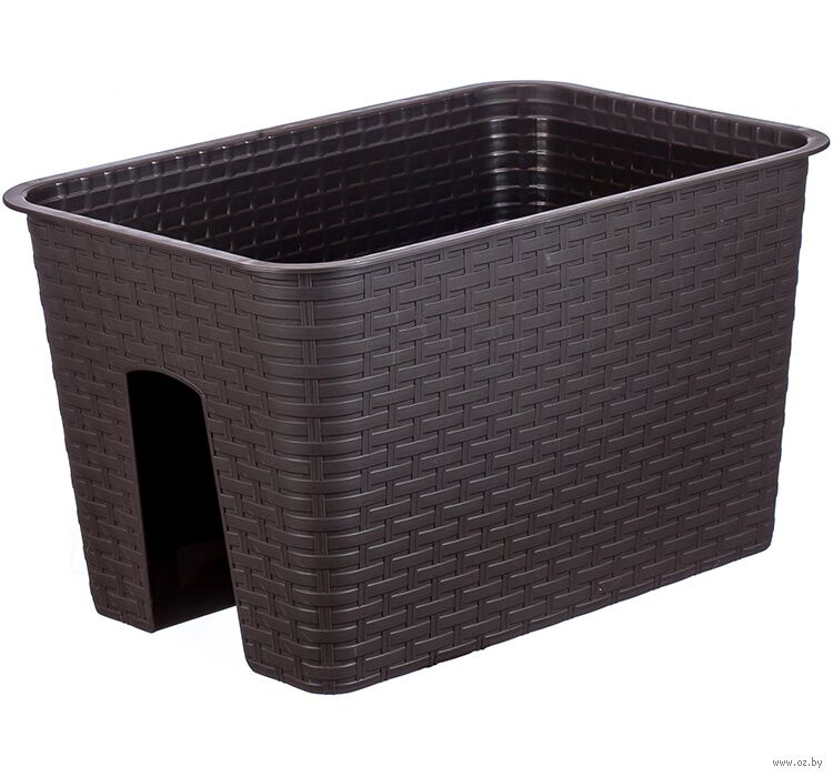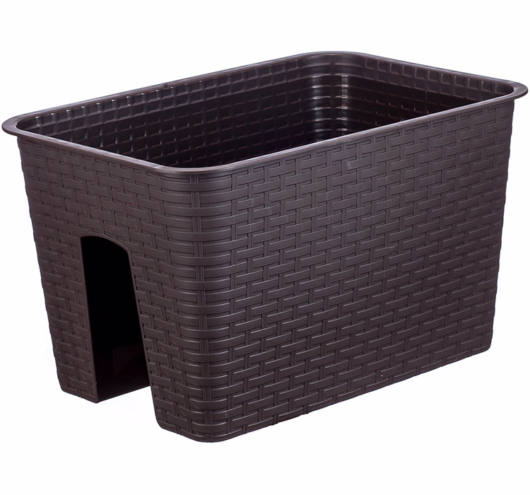 Благодаря простому креплению устанавливается на перила разной ширины. Легко моется, не боится прямых солнечных лучей. Отличается объемной текстурой, имитирующей ротанговое плетение. Столбики с отверстиями на дне изделия обеспечивают доступ воздуха и выход лишней влаги во время дождя.