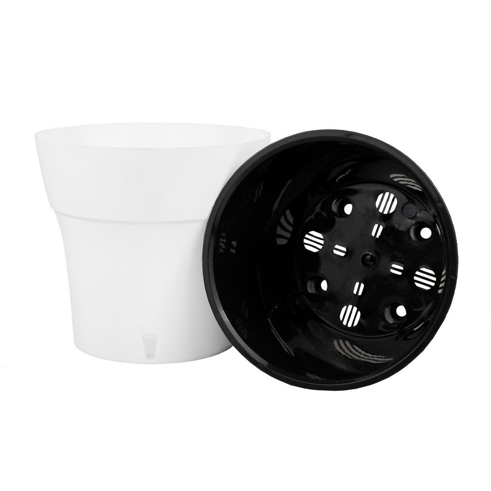 Двойной вазон исключает протекания и загрязнения. Вместительный резервуар для воды надолго обеспечит растение влагой и создаст достаточную относительную влажность для здорового развития растения. На дно внутреннего вазона обязательно выкладывают дренаж толщиной в 2-5 см (в зависимости от вида цветов и литража горшка).