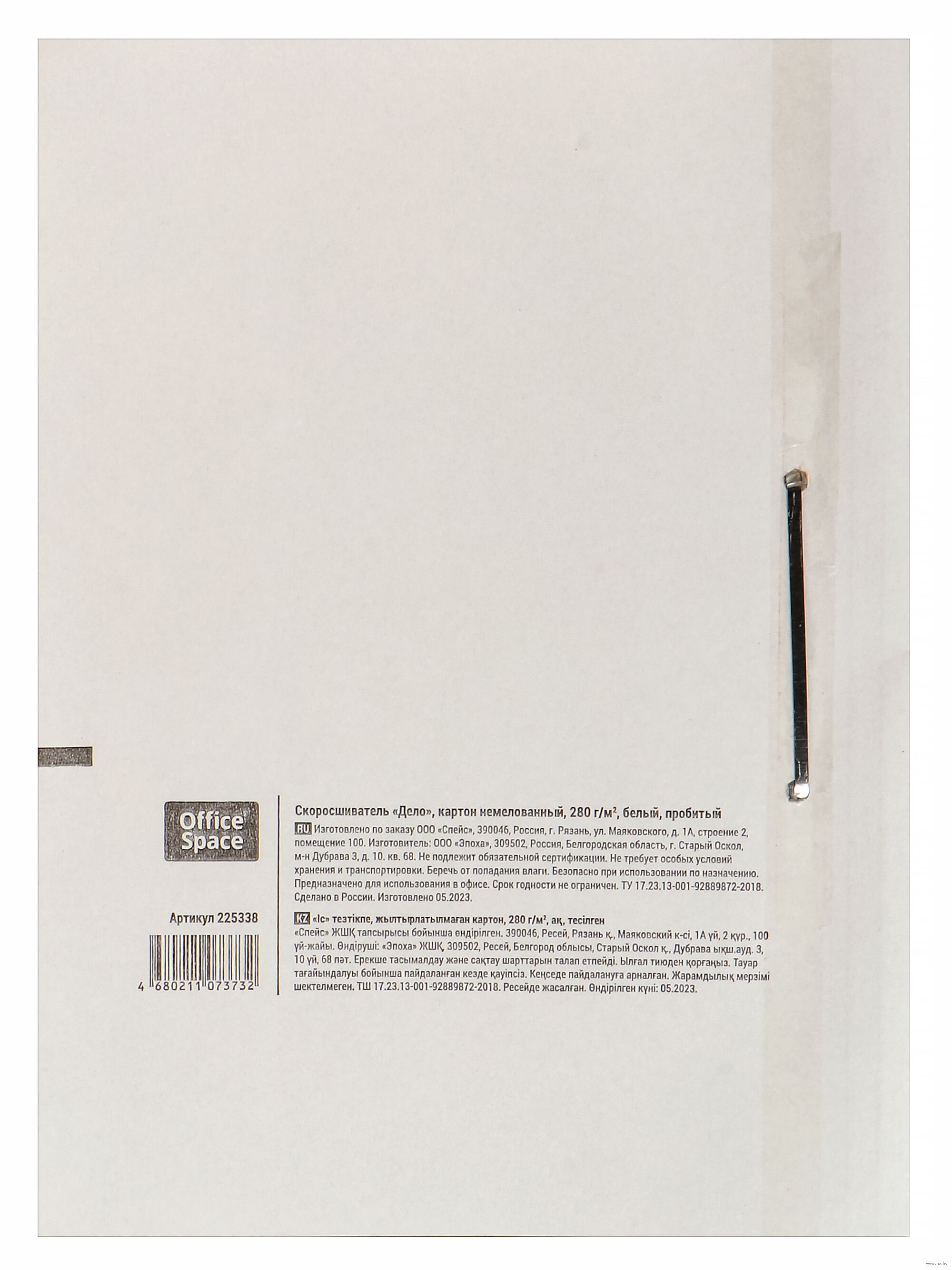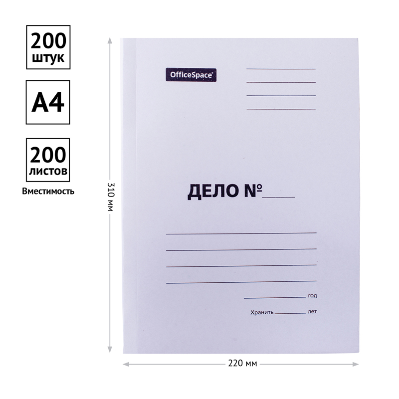Папка размером 310х220 мм изготовлена из немелованного картона плотностью 280 г/м2. Обложка изделия – белая с полями для надписей. Ширина корешка 30 мм.