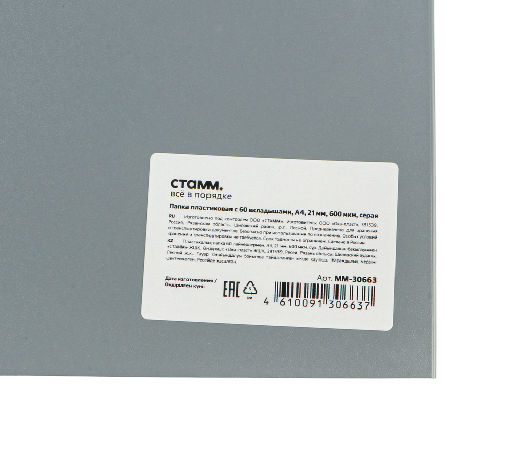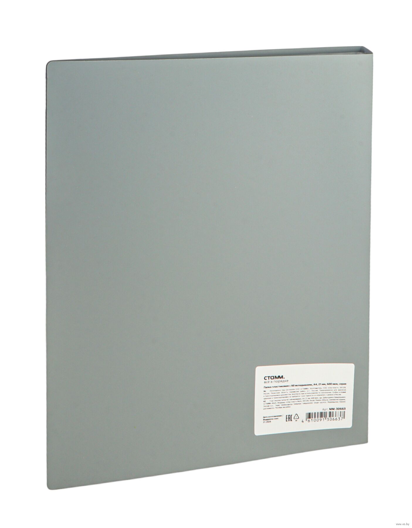 Папка с 60 вкладышами "СТАММ" предназначена для хранения бумаг формата А4. Цвет папки – серый. Папка изготовлена из качественного полипропилена плотностью 600 мкм с текстурой "песок". Тип скрепления – термосварка.