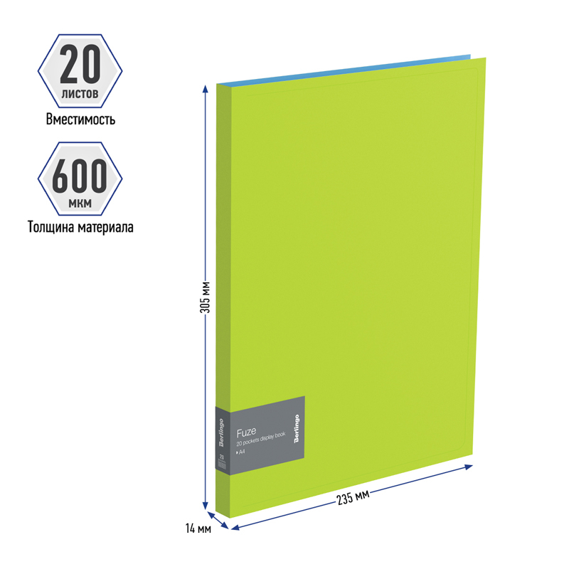 Папка Berlingo с 20 вкладышами формата А4 станет отличным и стильным помощником для хранения документов. Выполнена в ярких контрастных цветах концепции Fuze. Цвет папки – салатовый.