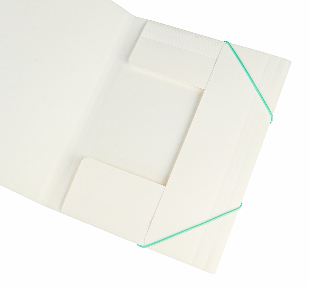 Изготовлена из высококачественного полипропилена толщиной 600 мкм (0,6 мм) с матовой текстурой поверхности "песок", на которой не видно отпечатков пальцев и мелких царапин. Папка имеет надёжные застёжки-резинки салатового цвета. Клапаны защищают документы от повреждений и загрязнений.