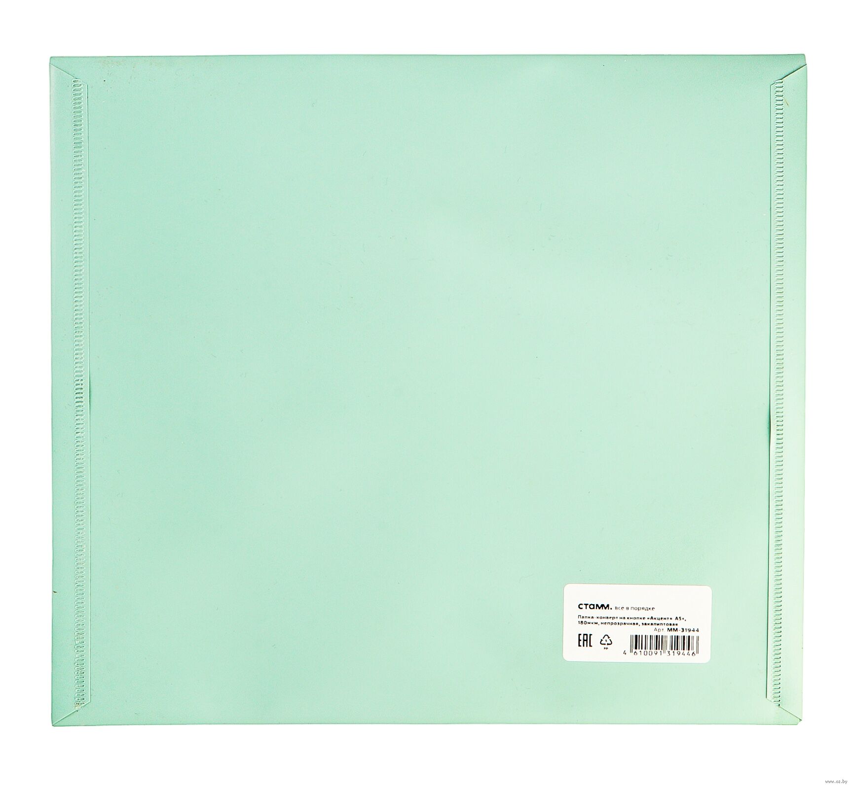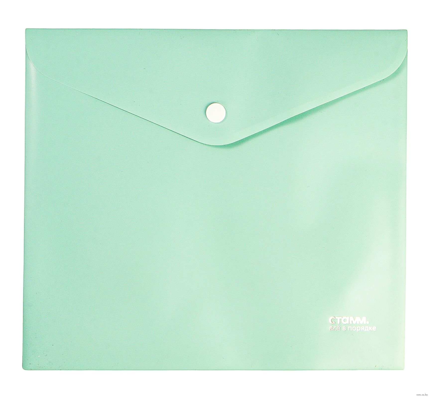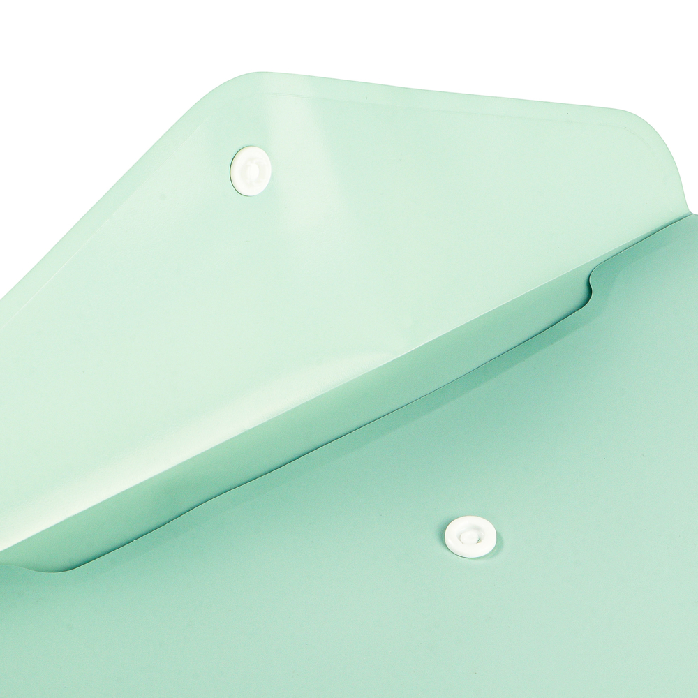 Папка-конверт на кнопке формата А5+ надежно защищает документы от влаги и пыли. Горизонтальное изделие вмещает до 100 листов. Цвет папки – эвкалиптовый. Она изготовлена из качественного полипропилена плотностью 180 мкм с матовой текстурой. Она плотно закрывается на кнопку.