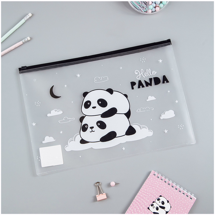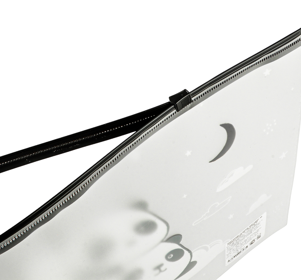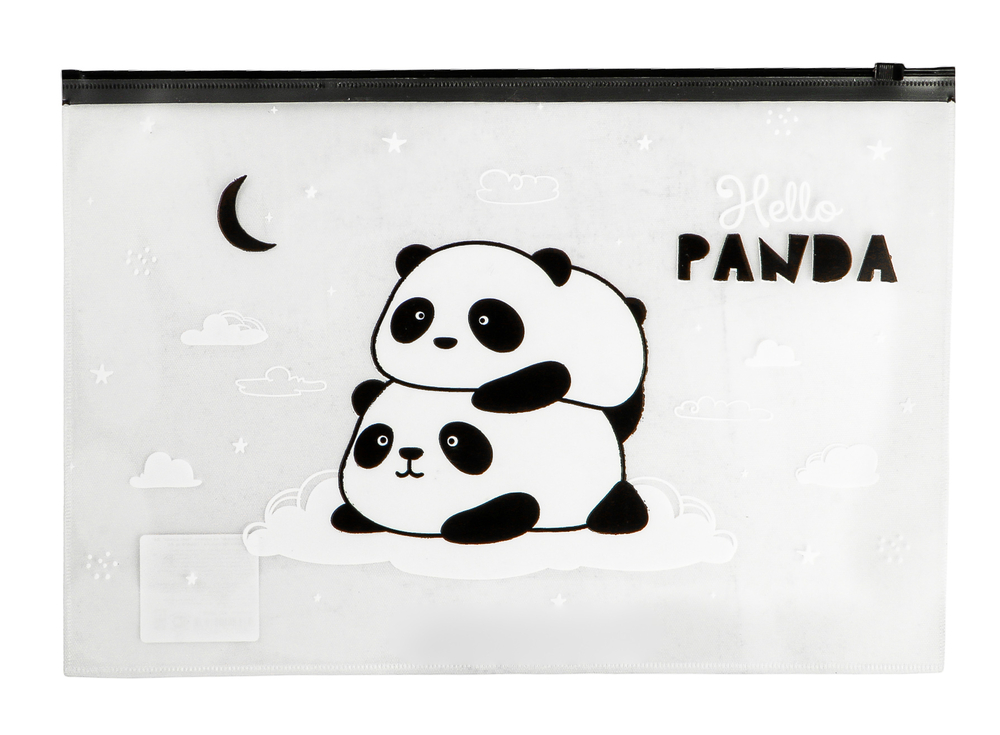 Папка-конверт на молнии – стильный помощник, который подойдет для хранения тетрадей, блокнотов, ежедневников форматов А4 и А5. Папка формата А4 вмещает до 60 листов стандартной офисной бумаги. Изготовлена из прочного полипропилена толщиной 150 мкм с гладкой фактурой. Папка имеет герметичную застежку-зиплок чёрного цвета, которая защищает документы от механических повреждений, пыли и влаги. Милый и стильный чёрно-белый рисунок с пандами понравится всем любителям современных дизайнов.